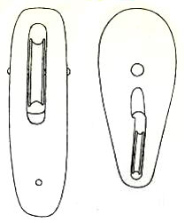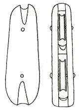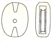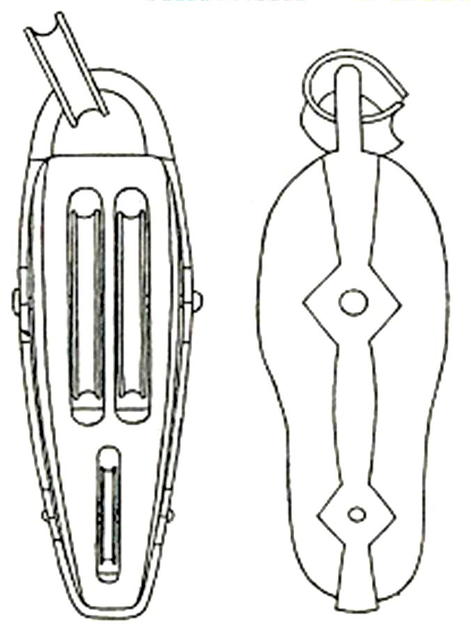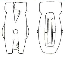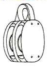 | Bigotta | Bozzello da carica scotte (vista laterale e frontale) fatto al tornio, risalente al Medioevo | Vista laterale e frontale di bozzello a violino (due pulegge di diametro diverso) del XVIII/XIX secolo. |