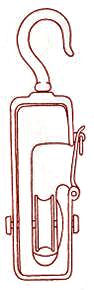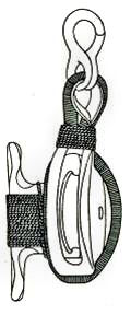 | Bozzello a violino triplo con stroppo esterno e redancia per la gassa del penzolo (XIX sec) | Pastecca con stroppo di ferro esterno e gancio a molinello (XIX sec | Bozzello semplice, con anello |