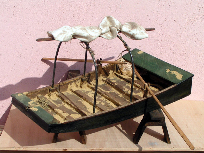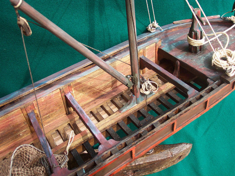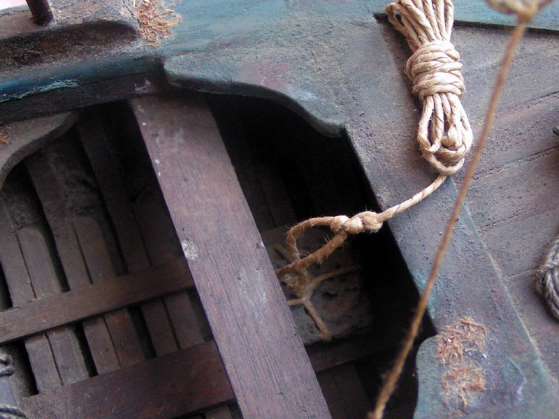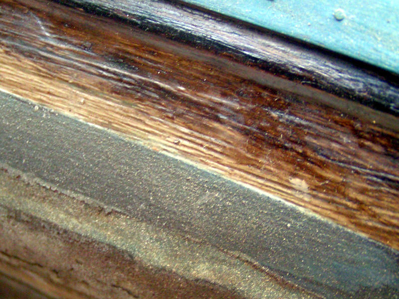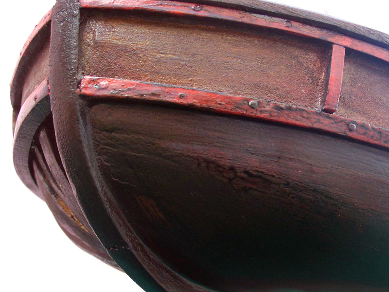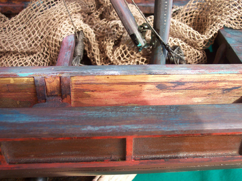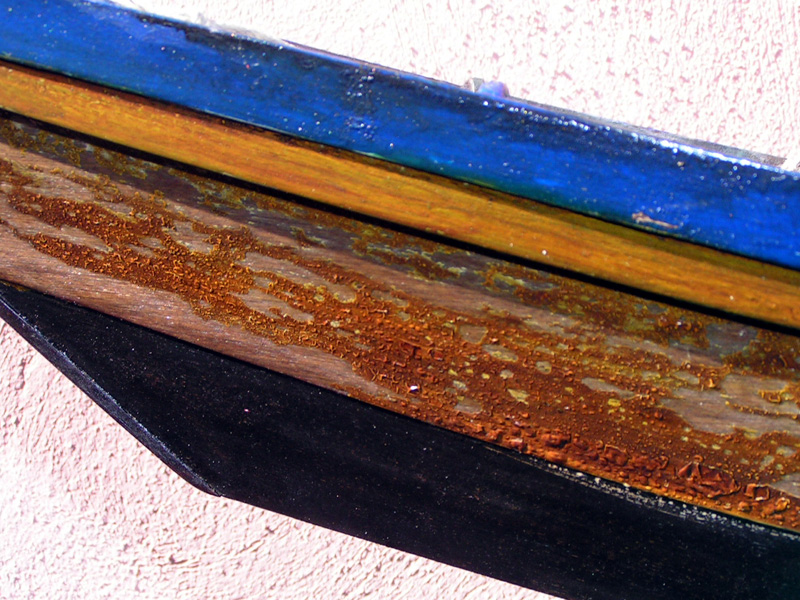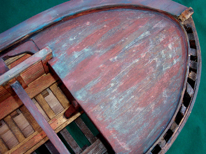 Modello vissuto: se si accavallano più patine, seguite da opportune scartavetrate tali da far emergere discontinuamente i sottostanti colori, si ottiene il tipico effetto della sovrapposizione di verniciatura. Una successiva passata di bitume ben diluito fornirà quel tocco di antico cercato. Altro metodo consiste nel passare in modo discontinuo e casuale dell’olio sulla superficie per poi trattarla con dell’acrilico. In questo modo si noterà come l’acrilico non aderirà sul legno oleoso, mentre asciugherà su quello non trattato. Una leggera scartavetrata fornirà l’effetto di uno scafo dal quale parte della verniciatura si è staccata evidenziando in quei punti la base lignea. Solita passata di bitume a finire.