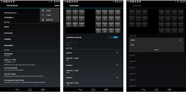 Da segnalare in questa app, all’interno del settaggio (chiave inglese) i comandi per nominare i buttons (Name), il codice (Command) da assegnare a ciascun tasto, l’orientamento della tastiera (Orientation), la dimensione (Button Size) dei tasti e “ON/OFF Mode” che tasto per tasto permette il funzionamento in monostabile o bistabile delle uscite; ovvio che c’è anche altro ma quelli citati sono i comandi principali. Settaggio Parametri e percorso: Piccola chiave inglese, PREFERENCE, Controller A (default), Name. Cliccare su button1, button2…..per cambiare nome al pulsante; tornare indietro col il solito triangolino che ci permette di cambiare schermata sul telefono, cliccare su Command per assegnare il codice al pulsante; tornare indietro col il solito triangolino e andare su Option per orientamento preferendo PORTRAIT. Cliccare su Combination Send Mode, Another Command’s Source per selezionare funzionamento dei singoli relè in bistabile o monostabile e cambio del colore quando attivati. Bottone per bottone si deve deselezionare la casella relativa e chi volesse fondo bianco sempre sulla pagina PREFERENCE dovrà andare su White Background ; il comando Visibility permette di visualizzare i tasti che interessano (da 1 a 16). Anche in questa app ho utilizzato gli stessi e sperimentati codici 1,2,3,4,5,6,7,8,9 e da a,b,c,d,e,f,g.; anche in questa app, se il pulsante è stato attivato o meno, cambia il colore. Osservazione; in qualunque disposizione numerica di buttons l’ultimo conviene sempre codificarlo con la lettera “i”; non so perché ma questo codice resetta tutti i relè attivi e quindi può fare molto comodo ( il codice “h” li attiva tutti, ma non ho capito perché!). In conclusione le due app testate con l’hardware da me utilizzato permettono il comando di ben 16 canali aggiuntivi; segnalo questa mia esperienza perché permette di utilizzare telecomandi a 6/8 canali piuttosto che quelli irti di levette e che io chiamo “puntaspilli”. In qualche mostra e con modelli complessi ho visto addirittura l’utilizzo di due telecomandi; con questa mia applicazione può bastarne uno con notevole semplicità d’uso ed anche minor costo: in tutto ho speso meno di 30 euro.