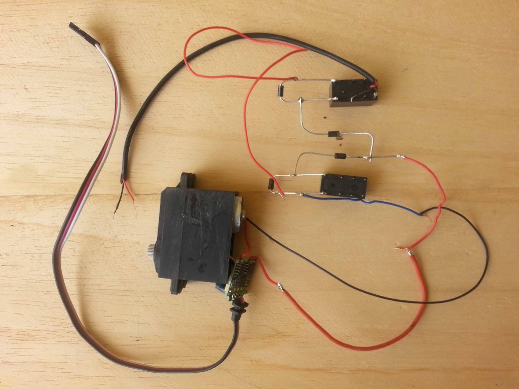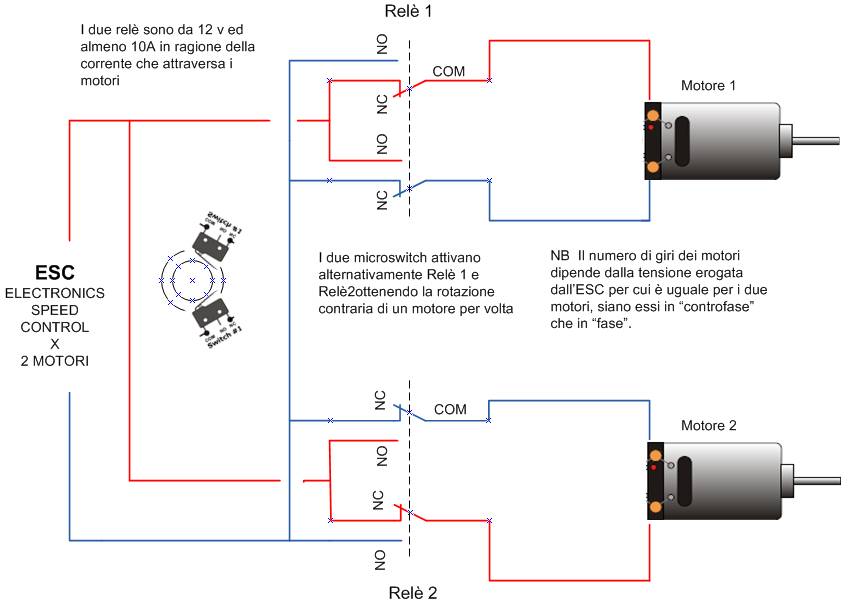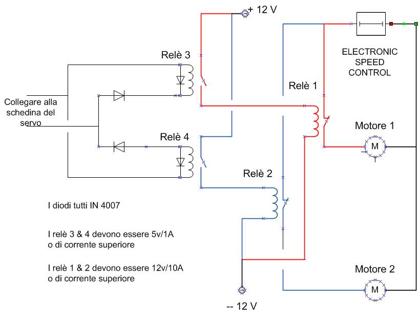 I fili blu e rosso sono i terminali di un ESC (regolatore di velocità); i due micro switch sono azionati da una camme montata sull’albero di un servo collegato in parallelo a quello del timone e fanno commutare autonomamente ed in sincrono con il movimento del timone i due relè.