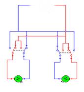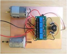 I relè dovranno essere a doppio scambio ed in grado di commutare le correnti che scorrono nei motori; i due motori, normalmente in “controfase”, se commutati gireranno entrambi a destra piuttosto che a sinistra e con eguale numero di giri. Lo svantaggio di questo circuito è quello di dover commutare le forti correnti che scorrono nei motori; il vantaggio, come già detto, è di poter, sia pure ad eguale numero di giri, mettere in “fase” i due motori. Allego foto del prototipo realizzato con parti di recupero.
