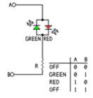 A titolo puramente informativo vi segnalo il “led bipolare bicolore” , un componente molto utile. Tale led da utilizzare come gli altri led e quindi con resistenza di carico, se collegato tra i poli dei motori, a seconda della polarità della tensione applicata, fornirà una luce di un colore definito (normalmente verde/rosso). Questo semplice accorgimento ci permetterà di vedere se i motori girano in “controfase” o in “fase” senza dover utilizzare il tester. Ai punti A e B si potrà applicare indifferentemente una tensione positiva o una tensione negativa.