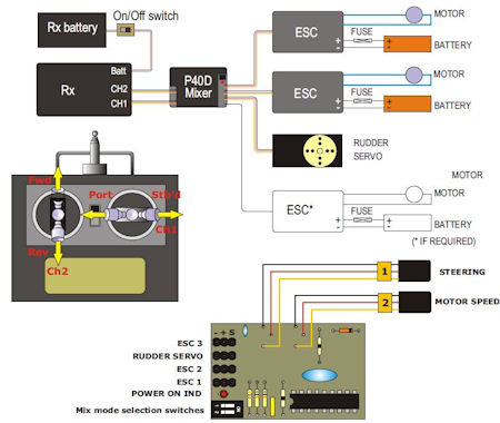 Il Rudder Mixer (£ 30,00) è simile al P40 perché ha bisogno per pilotare i motori di due ESC ( regolatore di velocità) ma necessita di una sola batteria; da notare che tutti e tre i dispositivi possono pilotare anche unità suono motore, mio consiglio MK2 (£ 52,95 montata sulla mia Smit Nederland) e MK3 (£ 32,00) due unità veramente realistiche e programmabili.