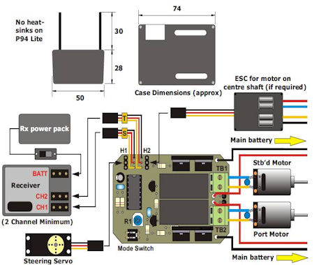 Come si può vedere dai due schemi entrambi i dispositivi possono gestire due o tre motori però con differenti metodologie; il primo, P40 (£ 28,00), a seconda del numero di motori, necessita di due o tre ESC ed altrettante batterie. Il secondo P94 (£ 79,00, che ho utilizzato sulla mia Smit Nederland), include nel medesimo dispositivo sia la gestione che i due ESC per il diretto pilotaggio dei due motori; di questo sistema da considerare la massima esemplificazione.