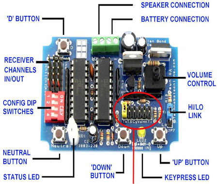 I dip switch cerchiati in rosso selezionano i parametri del motore come velocità massima, tempo di inattività del motore prima di fermarsi, “voce”, cilindri, etc. La MK3 e sostanzialmente simile; si differenzia essenzialmente per il volume non regolabile e per il sistema della programmazione.