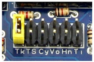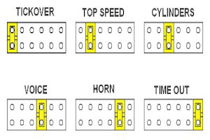 I dip switch cerchiati in rosso selezionano i parametri del motore come velocità massima, tempo di inattività del motore prima di fermarsi, “voce”, cilindri, etc.