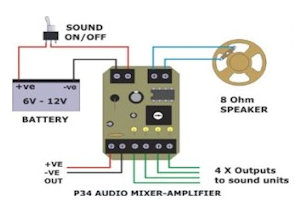 Un’unità per mixare fino a quattro unità sonore ACTion in un unico altoparlante. Il mixer / amplificatore ha anche una connessione di distribuzione dell’alimentazione che guiderà fino a quattro unità audio, riducendo così il cablaggio richiesto. L’unità dovrà essere accesa mentre il modello è operativo. I singoli simulatori sonori possono essere attivati tramite radiocomando come e quando richiesto. Tutte le attuali unità audio ACTion possono funzionare da 6 a 12 volt.