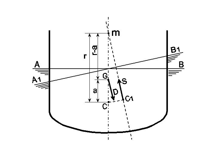 Un precisazione, prima che qualcuno protesti. Effettivamente la spinta S, nel disegno, non è applicata in C bensì in C1. Tenete presente che, a modello dritto sia la freccia D che la freccia S sono perpendicolari alla linea di galleggiamento A-B, uguali e contrapposte lungo l’asse di simmetria della nave. Perdonatemi ma è solo per non pasticciare troppo il disegno. Fra poco sarà tutto più chiaro. Adesso diamo una ditata al nostro modello e costringiamolo ad abbattersi un po’ su un fianco. Cioè lo costringiamo a passare dal galleggiamento A-B al galleggiamento A1-B1 (sempre per semplicità grafica è stato meglio spostare l’acqua e non il modello). Cosa abbiamo combinato? Il centro di gravità G è sempre nello stesso posto e la freccia D, che rappresenta il peso, è ora perpendicolare alla nuova linea di galleggiamento A1-B1. Il centro di carena C, invece, si è spostato nella posizione C1. Ed ecco che adesso la spinta S è applicata in questo nuovo centro di carena C1, naturalmente anche lei perpendicolare alla nuova linea di galleggiamento A1-B1. Penso che tutto questo sia chiaro. Adesso possiamo passare ad individuare una serie di elementi che ci aiuteranno a capire come aiutare il nostro modello a starsene ben dritto in acqua. Innanzi tutto notiamo che le due forze D e S creano una coppia che tende a raddrizzare lo scafo. Poi, attraverso il nuovo centro di carena C1, facciamo passare una linea tratteggiata, perpendicolare alla linea di galleggiamento, e prolunghiamola fino a farle incontrare l’asse di mezzeria della nave. Il punto di incontro lo indichiamo con m. Questo punto è estremamente importante e si chiama metacentro. Adesso guardiamo bene il disegno.