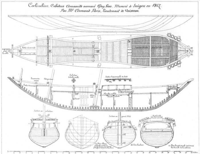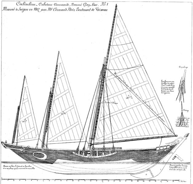 Anche questa volta “girovagando” in internet ho trovato una cosa interessante, o comunque un po’ fuori dall’ordinario. Si tratta di un natante chiamato “Gay-Bao” originario della Cocincina (attuale Vietnam), lungo una trentina di metri e provvisto di tre vele latine e fin qui niente di straordinario, senonchè osservando bene i disegni salta all’occhio una particolarità, si tratta della forma della coperta la quale, a differenza di tutte le altre imbarcazioni, è più stretta al centro della nave rispetto alle zone di prua e di poppa. Se questa è una stranezza, l’opposto può dirsi dei due occhi dipinti a prua che si ritrovano in un gran numero di imbarcazioni di tutto il mondo, occhi stilizzati che non servivano per abbellire lo scafo, ma nell’immaginario dovevano servire alla nave per vedere, evitando cosi le insidie del mare sfuggite al timoniere e al capitano. Le tavole dei disegni sono completate da un’ampia descrizione in Francese, a voi il compito della traduzione. (Il modellista moderno deve conoscere le lingue!) Le misure per i disegni sono state effettuate a Saigon nel 1867 dal tenente di vascello Armand Paris e sono rintracciabili ai seguenti indirizzi internet: