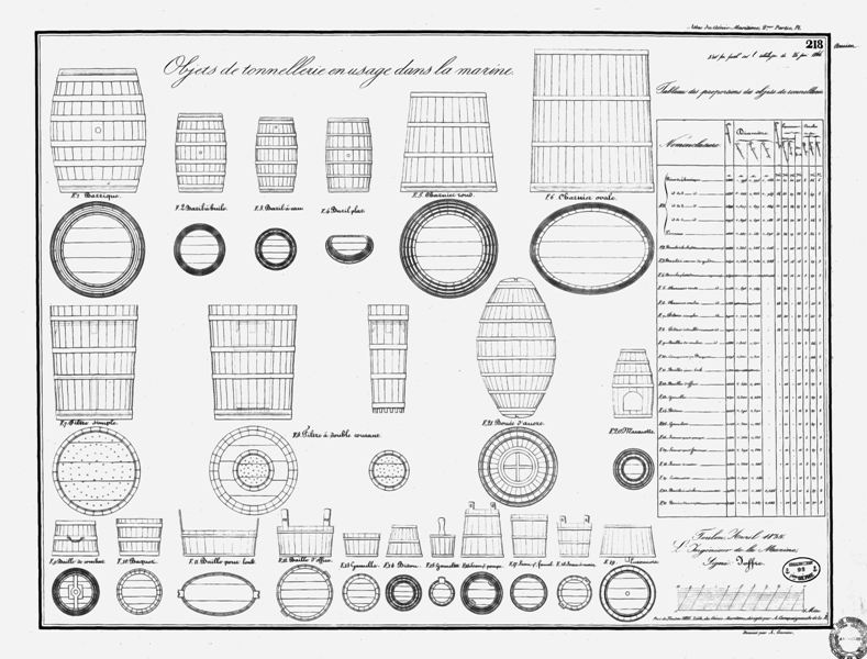Girovagando nel Web, curiosando tra un sito e I’altre, ho trovato diverse cosette che possono interessare i modellisti navali, da qui la decisione di scrivere qualche riga, sperando che sia di aiuto ai Modellisti dell’ANVO. Prendiamo un appartamento che sia vasto, luminoso, con un bel terrazzo, ecc. ma per essere bello va completato con un arredamento che lo renda nello stesso tempo piacevole e funzionale. Similmente i modelli di nave, sia pure di fattura raffinata, devono essere completati con una serie di oggetti. Poiché ogni singolo oggetto ha un suo ruolo ben definito, esso non va posta a casaccio ma in luogo ben preciso. Per fare un’analogia con I’appartamento di cui sopra, non metterete la lavatrice di fianco al letto, cosi come non metterete mai un barile appeso al trinchetto. Tra le varie categorie di oggetti, questa volta la scelta e caduta sui contenitori, e cioè Barili, Secchi, ecc. Poiché sulle navi nulla era lasciato al caso, tutti questi pezzi avevano delle forme e delle misure ben definite e codificate, oggi le chiameremo Standard. Nel disegno sottostante si vede una serie di contenitori ed a fianco una tabella (che a causa della riduzione del disegno non è decifrabile) che informa delle misure. Sui sito della Marina Militare Francese potete trovare una tavola espressamente dedicate a quanto sopra, e più esattamente all’indirizzo: