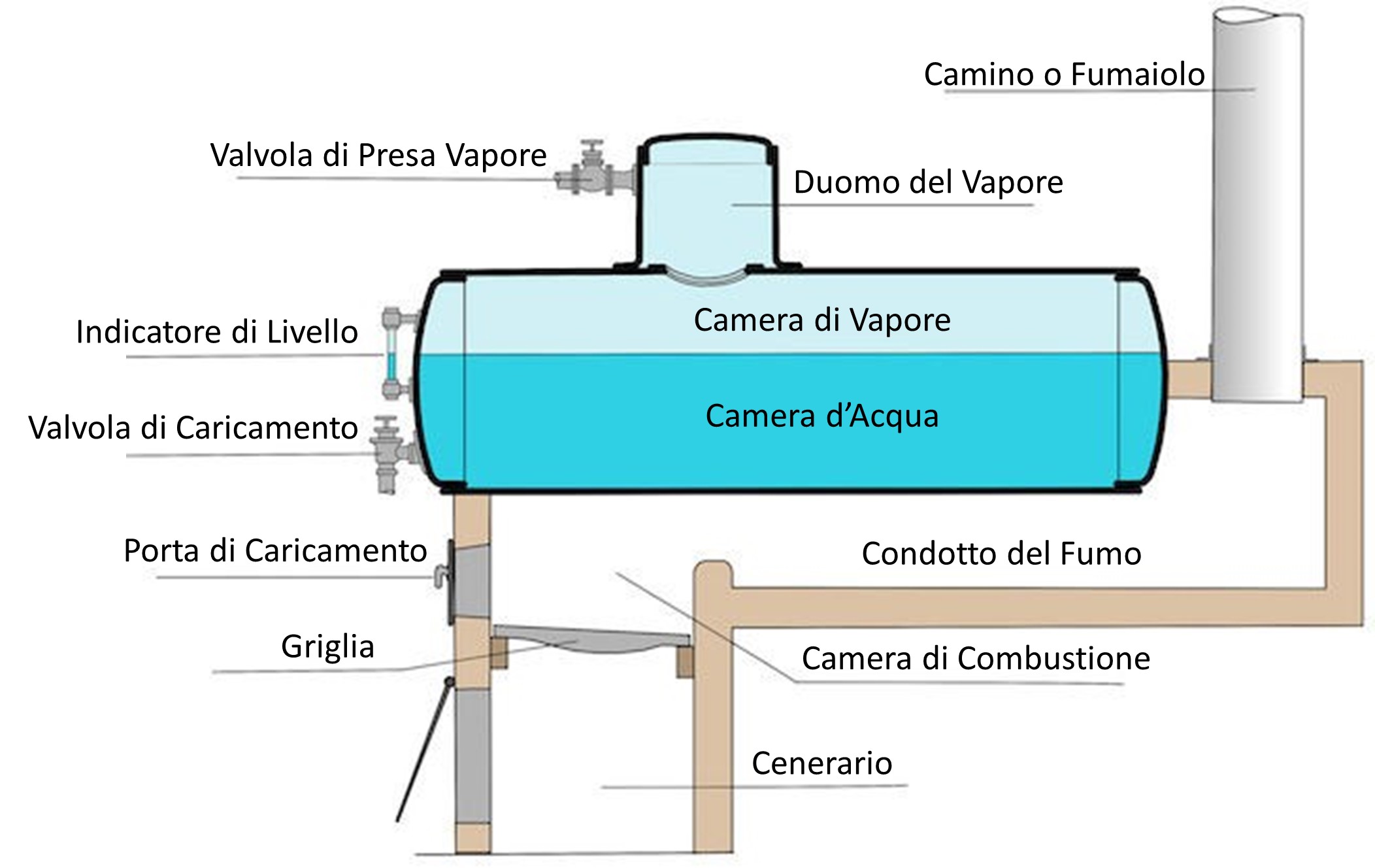 L’immagine a sinistra mostra una caldaia estremamente semplice nella quale sono ben individuabili le diverse parti. Si vede il focolare dove si produce il calore bruciando del carbone. C’è una griglia e, sotto, il cenerario. Il calore fa bollire l’acqua, contenuta nel serbatoio, che si trasforma in vapore. Questo viene prelevato attraverso la valvola di presa collegata al duomo dl vapore. Gli scarichi della combustione fuoriescono attraverso la ciminiera. Nel caso di alimentazione a nafta non ci sono la griglia ed il cenerario.