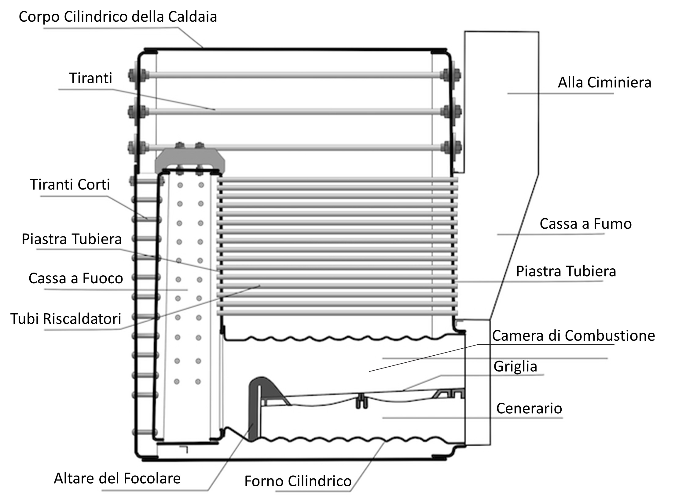 Questa immagine mostra, in maniera schematica, una caldaia cilindrica marina a ritorno di fiamma. I forni, cilindrici, sono nella parte inferiore. Al loro interno si trova una griglia sulla quale viene sistemato il carbone. Sopra la griglia c’è la camera di combustione. Sotto c’è il cenerario. La griglia è sostenuta da un muretto di mattoni refrattari detto “altare del focolare”. Le fiamme entrano nella cassa a fuoco, attraversano, internamente, il fascio tubiero e finiscono nella cassa a fumo.