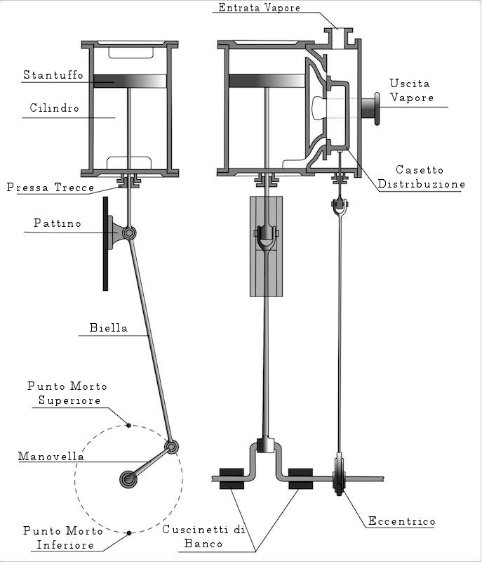 La macchina è composta, essenzialmente, da un cilindro all’interno del quale scorre uno stantuffo sulle cui facce agisce, alternativamente, il vapore.