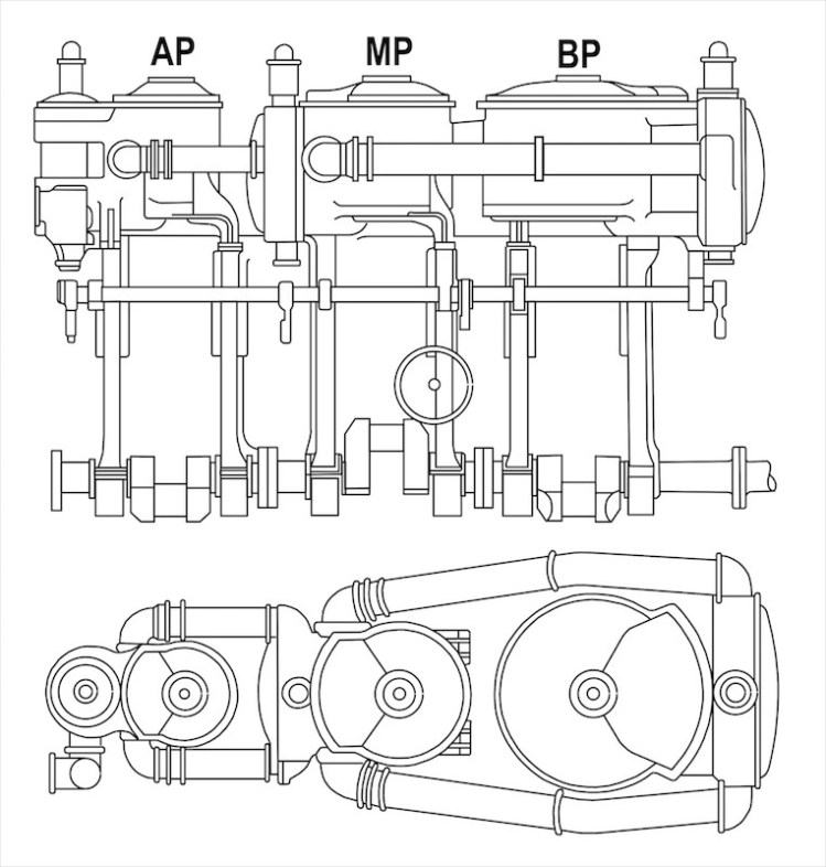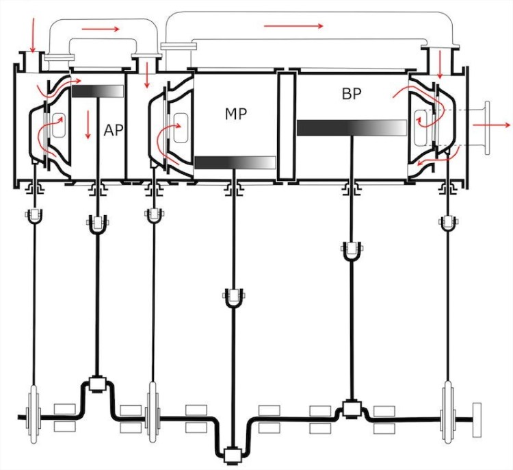Il vapore entra nel cilindro AP (alta pressione), passa nel cilindro MP (media pressione) e, infine, nel cilindro BP (bassa pressione). Il percorso del vapore è indicato dalle frecce rosse.