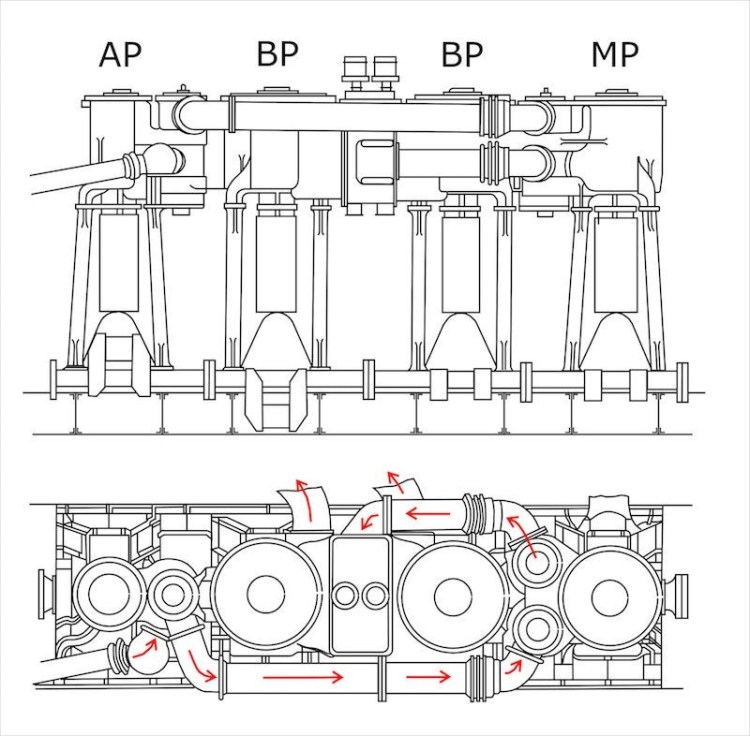 Si notino i due cilindri di bassa pressione. Le frecce rosse indicano il percorso del vapore. Ulteriori incrementi di potenza complessiva dell’impianto si sono ottenuti aggiungendo una turbina di bassa pressione che utilizzava l’energia ancora contenuta nel vapore di scarico.