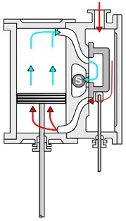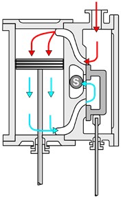 Entrambe le corse dello stantuffo sono utili, ovvero quando il vapore “fresco” spinge su una faccia, quello nell’altra camera, che ha già lavorato, viene espulso.