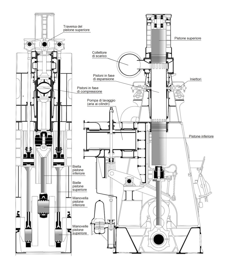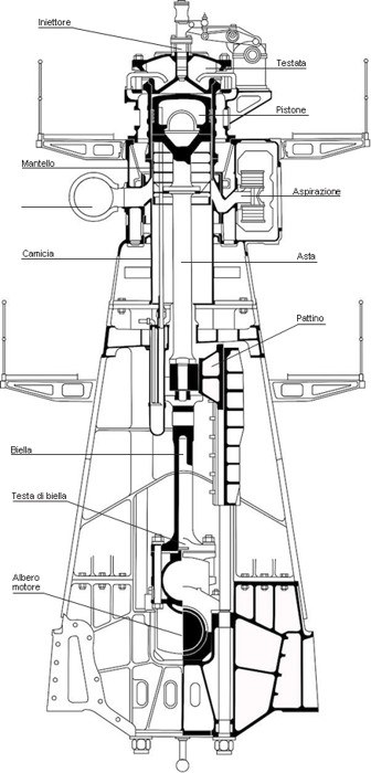In questa immagine è rappresentato, in sezione, il cilindro di un grande motore marino a due tempi. Il pistone è a semplice effetto. L’iniezione è pneumatica. Il motore, nel suo complesso, è formato da almeno sei cilindri come questo. Le potenze complessive posso- no variare da 2.000 a 24.000 Cv. Il pistone è costituito dalla testa e dal mantello ed è inserito in una camicia. Il pistone è collegato ad un’asta dotata di un pattino che scorre su apposita guida. Dal pattino parte la biella che si collega, inferiormente, alla ma- novella dell’albero motore. Questi motori, che hanno un regime di circa 120 giri al minuto, sono collegati direttamente all’asse dell’elica. L’avviamento avviene tramite immissione di aria compressa nei cilindri che si trovano oltre il punto morto superiore. Per invertire la marcia bisogna fermare il motore e riavviarlo immettendo aria compressa nei cilindri che non hanno ancora raggiunto, in rotazione avanti, il punto morto superiore.