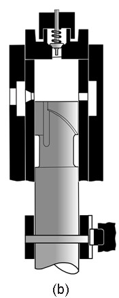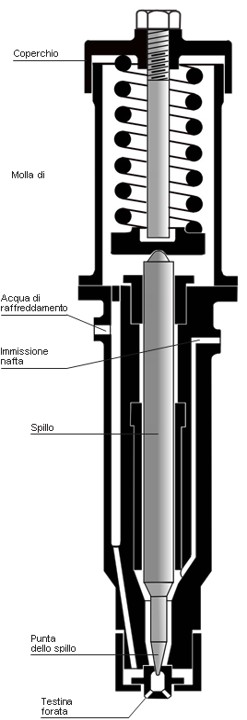 Questo, rappresentato a sinistra, è provvisto di uno spillo con diametri diversi. La nafta, quando viene immessa nella parte inferiore, spinge sulla parte superiore, di diametro maggiore, vincendo la pressione della molla (regolabile). In questo modo vengono aperti i fori della testina e la nafta entra nel cilindro finemente polverizzata. Più è fine la polverizzazione, maggiore è la superficie di contatto fra il combustibile e l’ossigeno dell’aria, ovvero migliore è la combustion (meno fumo e maggior rendimento)