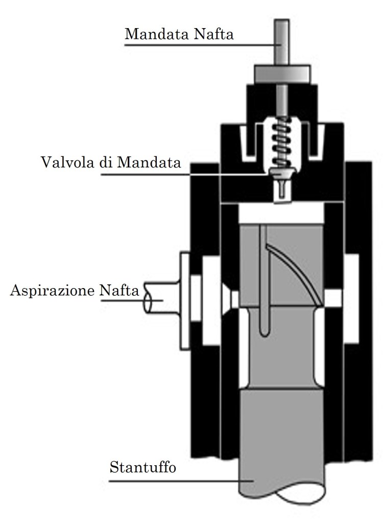 Perché un motore Diesel funzioni bisogna immettere della nafta, o del gasolio, nella camera di combustione quando il pistone ha raggiunto il punto morto superiore. Il combustibile, finemente polverizzato, viene a contatto con l’aria, fortemente compressa dal pistone, e, incendiandosi, sviluppa l’energia necessaria al funzionamento della macchina. Il sistema è semplice e funzionale. La pompa, rappresentata a destra con il pistone in mandata (a) e in aspirazione (b), si basa sulla rotazione del pistone che, grazie alla particolare forma, varia la quantità di nafta che può essere inviata, ad elevatissima pressione, all’iniettore.