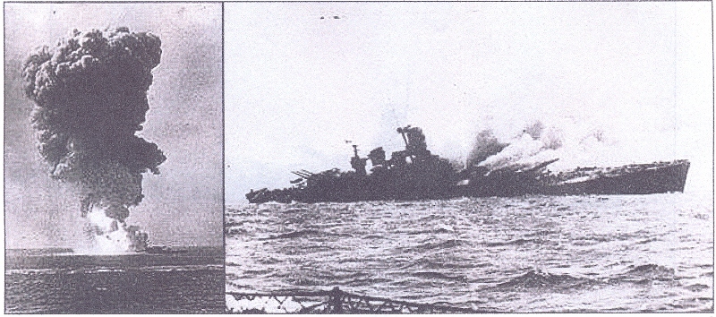 La corazzata Roma affonda, dopo essersi spezzata in due tronconi