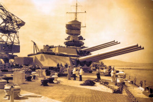 .La corazzata Roma in fase di capovolgimento, si spezzerà in due tronconi