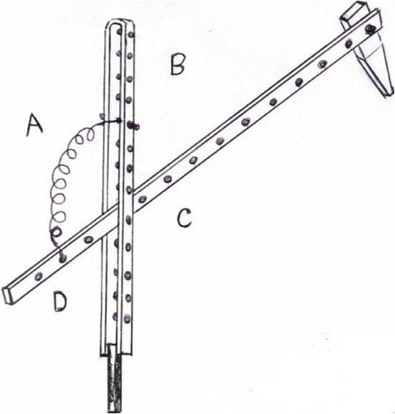 Come funziona: dopo aver fissato in maniera verticale il pezzo di ferro ad una base, regolare la lunghezza e l’altezza del listello di legno in modo che la parte terminale vada ad appoggiarsi esattamente dove si desidera, quindi inserire una coppiglia o una vite da 3 mm. nel’intersezione dei fori, precedentemente fatti a distanza millimetrica, ed inserire il pezzo di legno forato all’altezza della barretta di ferro anch’essa forata nello stesso modo. Applicare una molla a trazione (sfruttando i fori realizzati) nel settore desiderato ( A-B-C-D ), tra i listelli di legno e la barra in ferro.