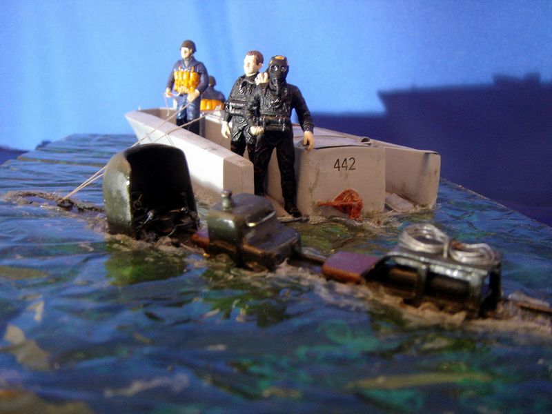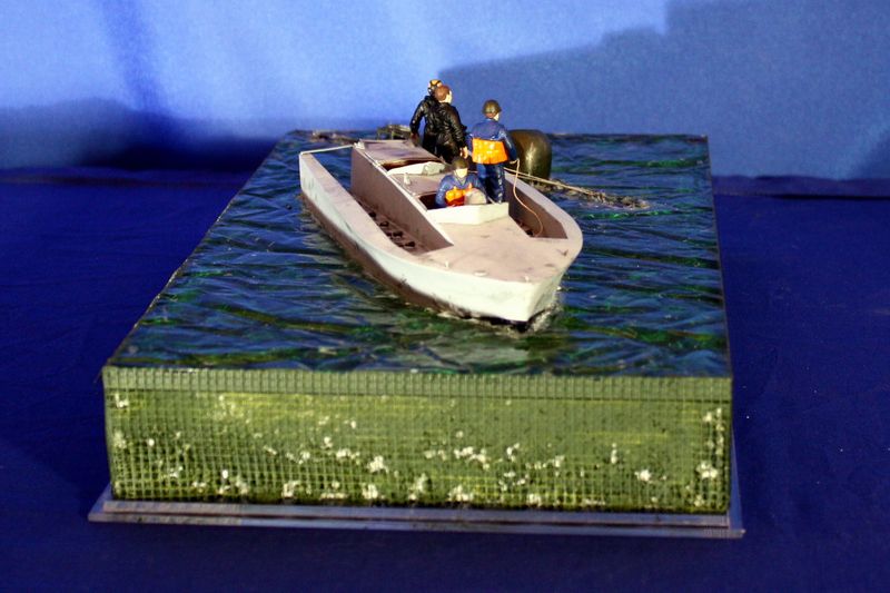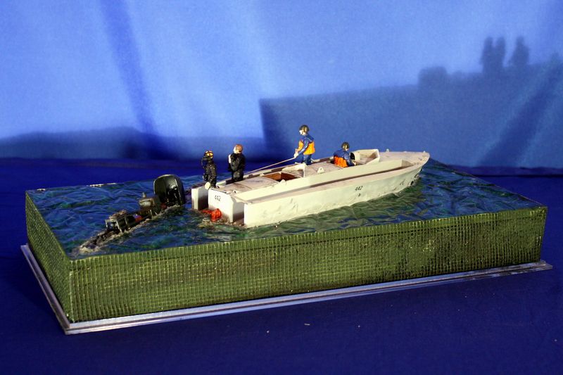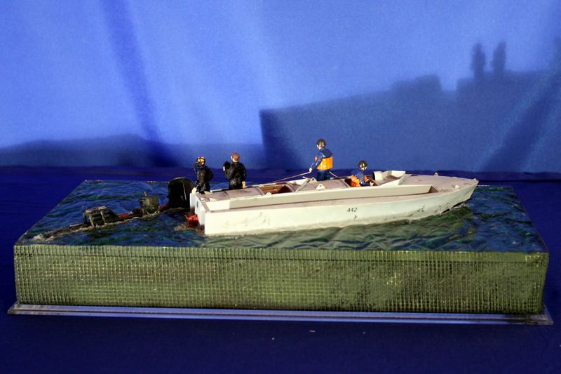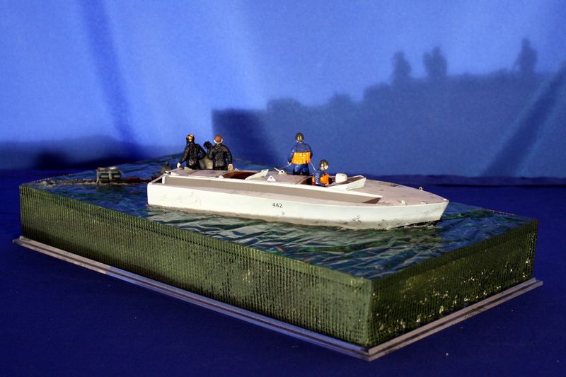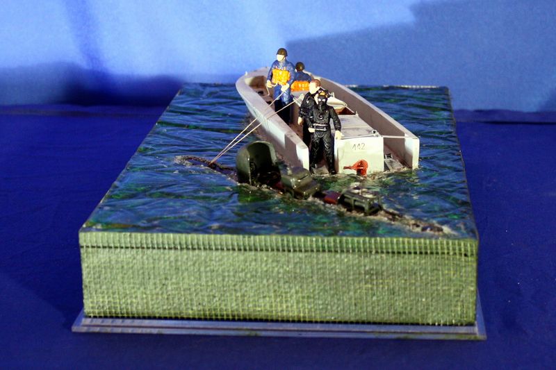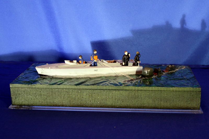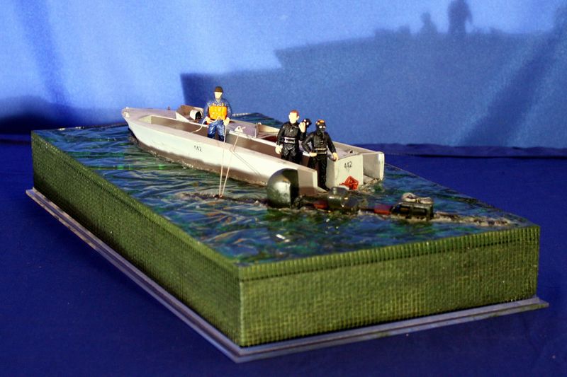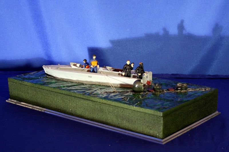 Il diorama, realizzato dal Sig. Dino Dall’asta in scala 1:35, illustra un motoscafo nel 1942 appositamente progettato per trasportare due siluri a lenta corsa (S.L.C.) in prossimità degli obiettivi. Uno dei siluri è in acqua e i due operatori, già provvisti di tute e respiratori, stanno per imbarcarsi.