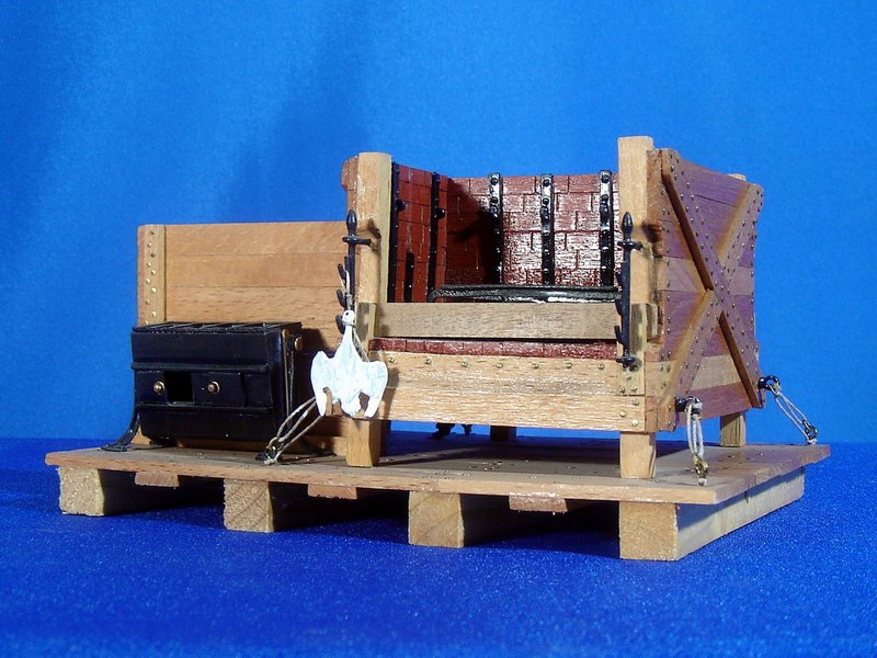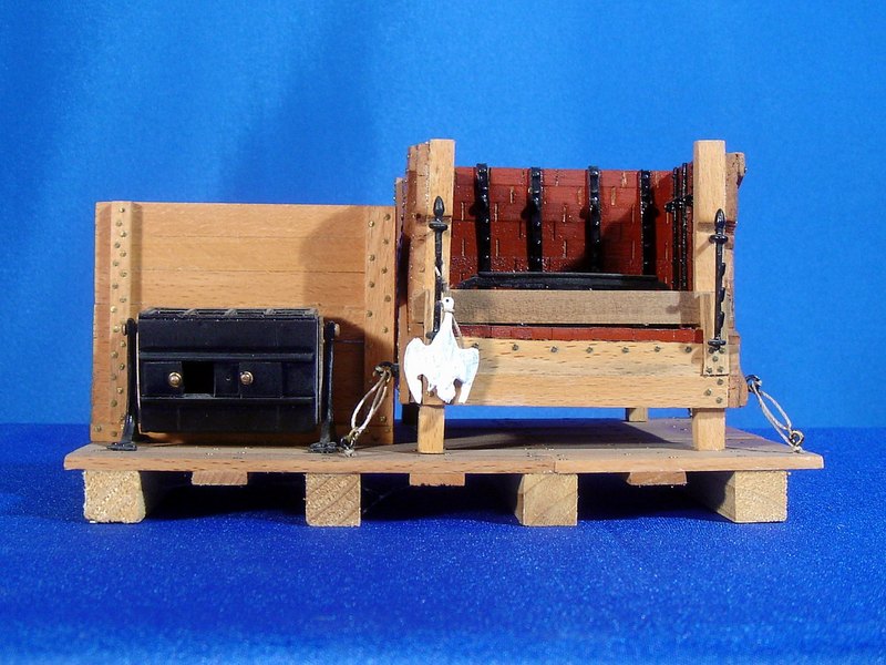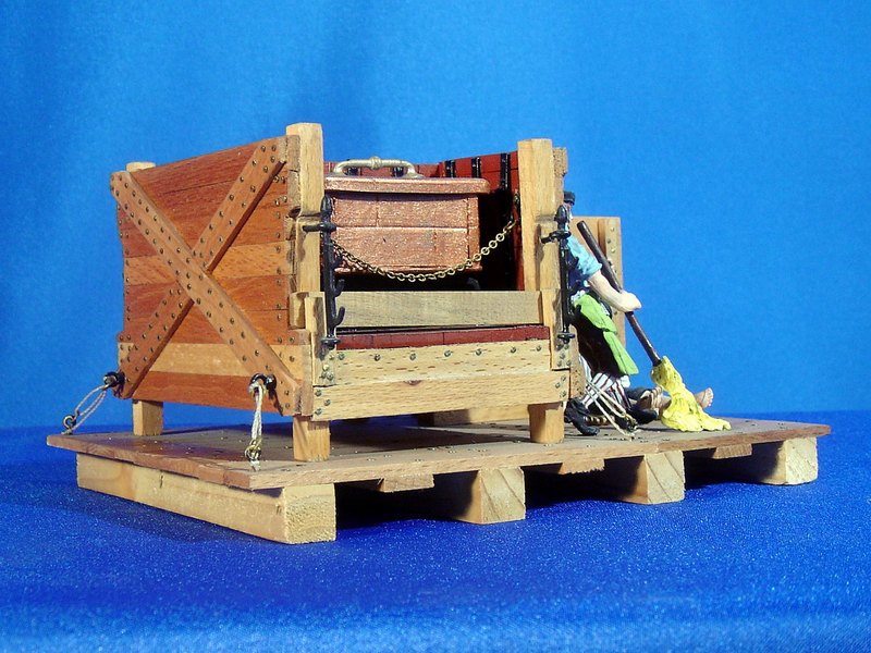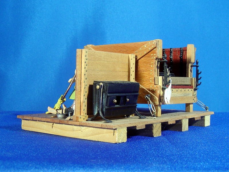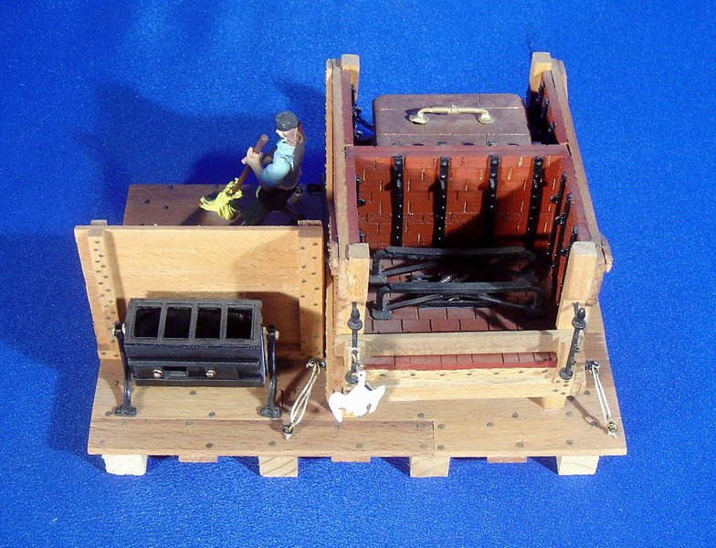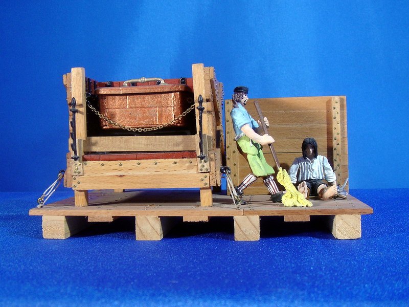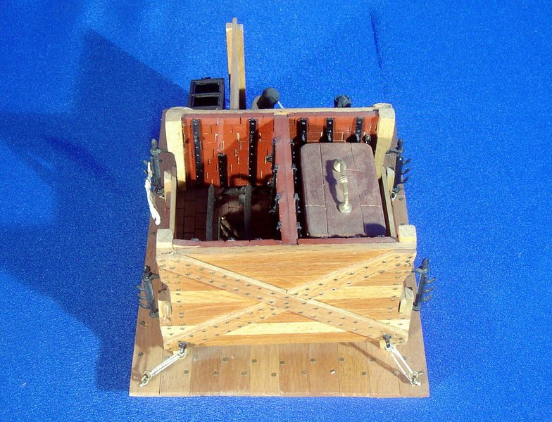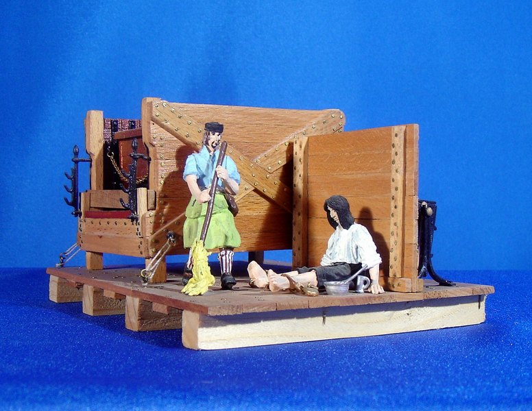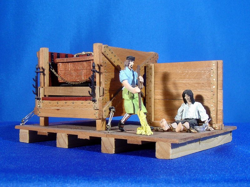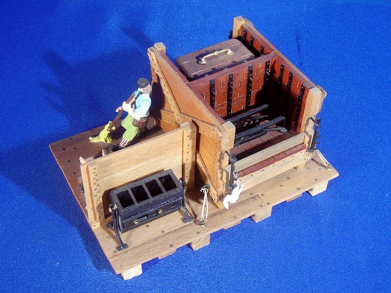 Il diorama, realizzato dal Sig. Massimo Borsari di dimensioni cm 31×17, riproduce la sala cucina di un vascello, la parte anteriore, verso prua, è il luogo di cottura, lungo la parete sinistra si trova un fornello di ferro, mentre a dritta c’è il luogo di detenzione per gli uomini dell’equipaggio in punizione. La ricostruzione è ispirata alla descrizione fatta da Jean Boudriot nella sua monumentale opera “Le vaisseau de 74 cannons” dove, in quattro volumi, viene minuziosamente analizzata sia la costruzione che la vita di bordo di un vascello della seconda metà del XVIII secolo. Nella realtà la cucina era posta sotto il castello di prua “non riprodotto nel diorama” ed era formata da una sorta di grande cassa dalle pareti laterali alte, costruita attorno a quattro colonne. Il fondo della cassa era riempito di sale grosso sul quale era posto uno strato di mattoni, come pure di mattoni era il rivestimento interno delle pareti e la parete divisoria. La cucina non era solidale con la struttura dello scafo perché, se così fosse stato, i movimenti della struttura avrebbero incrinato e distrutto la parete e i rivestimenti di mattoni. Il fissaggio era assicurato da robuste legature tra gli anelli fissati agli angoli della cucina e quelli posti sul ponte. La pentola era di rame e poteva contenere circa 600 kg di zuppa destinata all’equipaggio. I ganci sui supporti fissati alle colonne servivano per appoggiarvi il girarrosto. Il fornello accanto alla parete (altri due erano appoggiati alle fiancate) serviva per cucinare i pasti degli ufficiali.