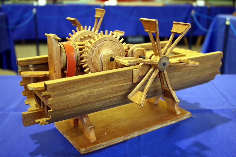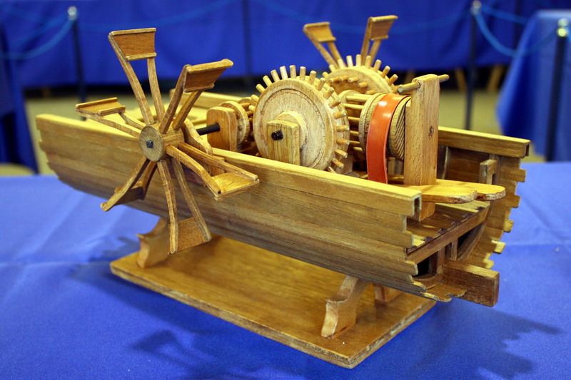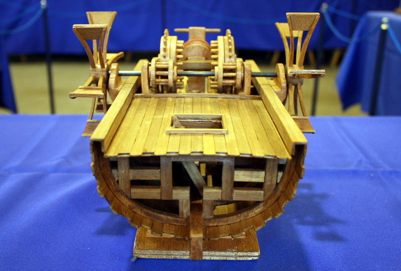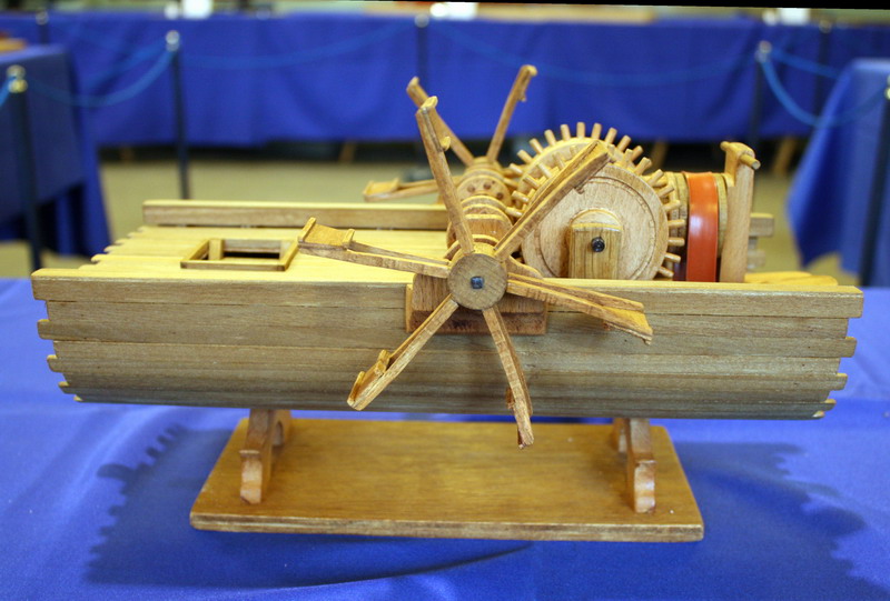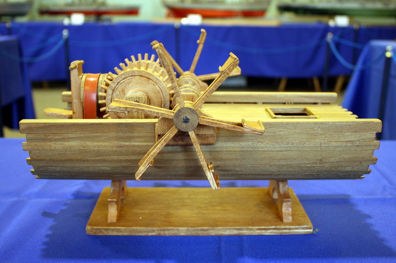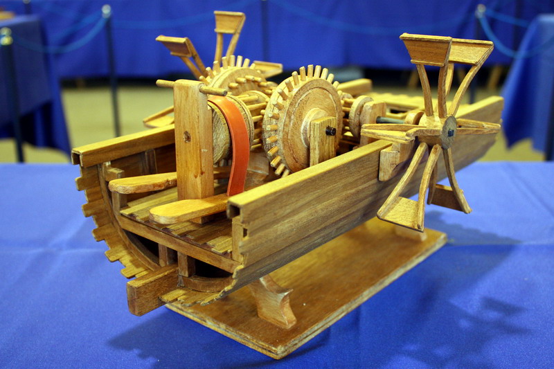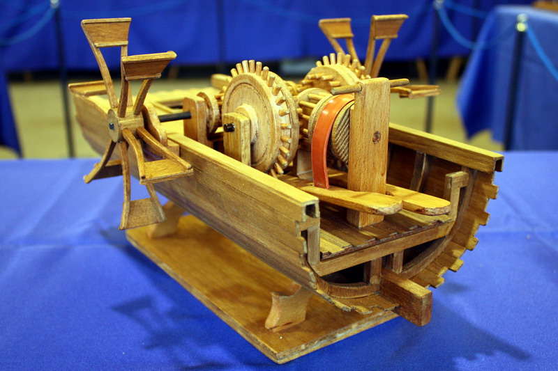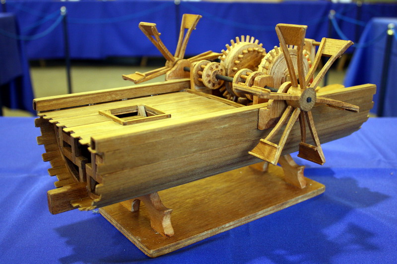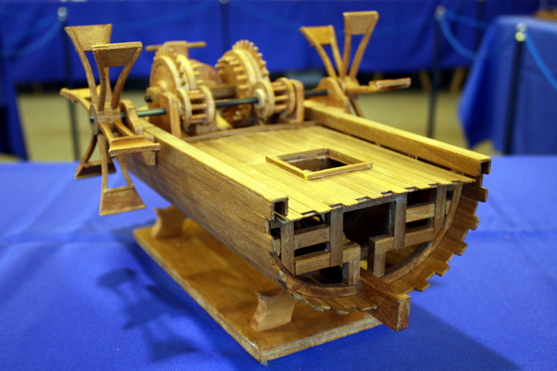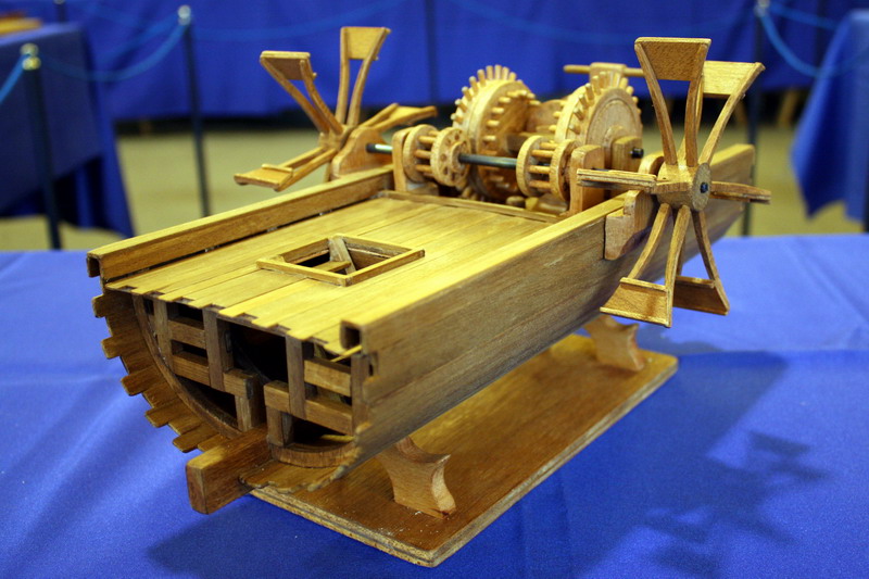 Leonardo da Vinci, dopo aver considerato il fatto che una corrente di acqua faceva girare una ruota a pale collegata ad un albero che, a sua volta, metteva in movimento delle macchine operatrici, elaborò l’idea di una imbarcazione a pale azionate da manovelle. Questo progetto costituisce una elaborazione della prima idea. Due pedane mobili, azionabili con i piedi, muovono, con moto alternato, un rocchetto a pioli. Questi ingranano su una ruota doppia la cui parte interna segue la rotazione alternata del rocchetto mentre la parte esterna, tramite un sistema di cricchetti, mantiene un unico senso di rotazione. Alla parte esterna delle due ruote sono collegate le pale che, immergendosi nell’acqua, in successione, provocano l’avanzamento dell’imbarcazione.