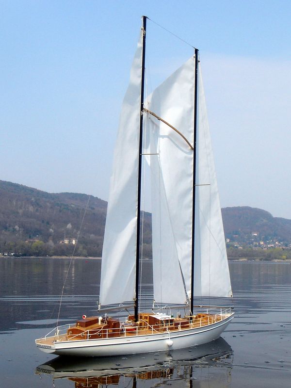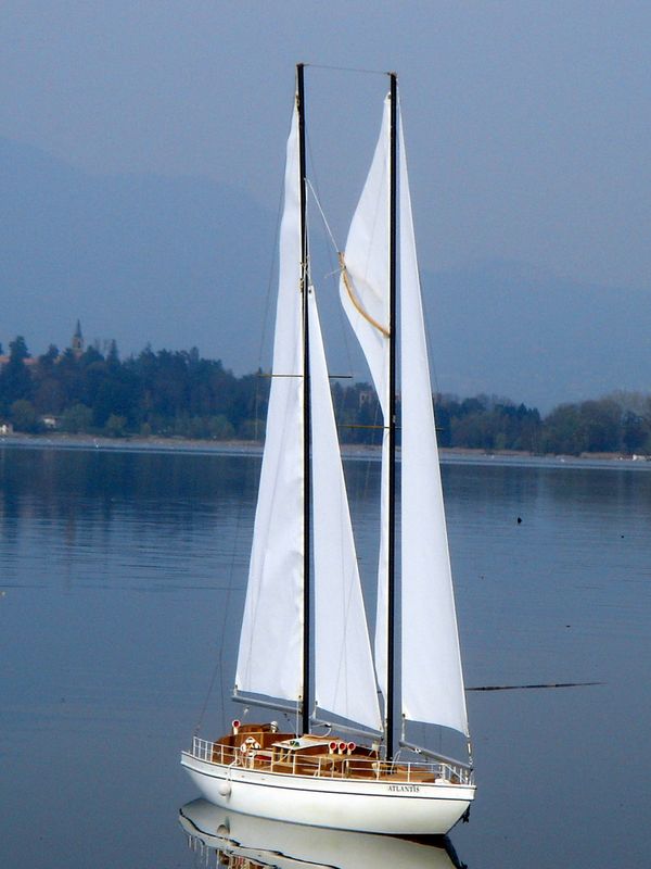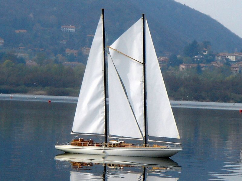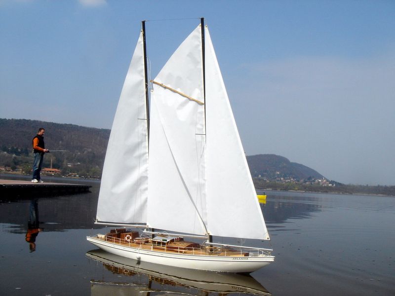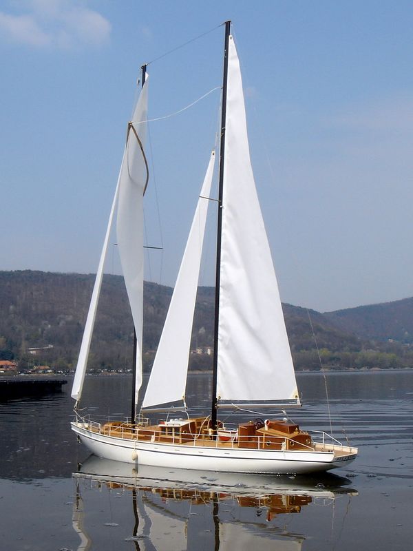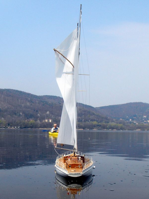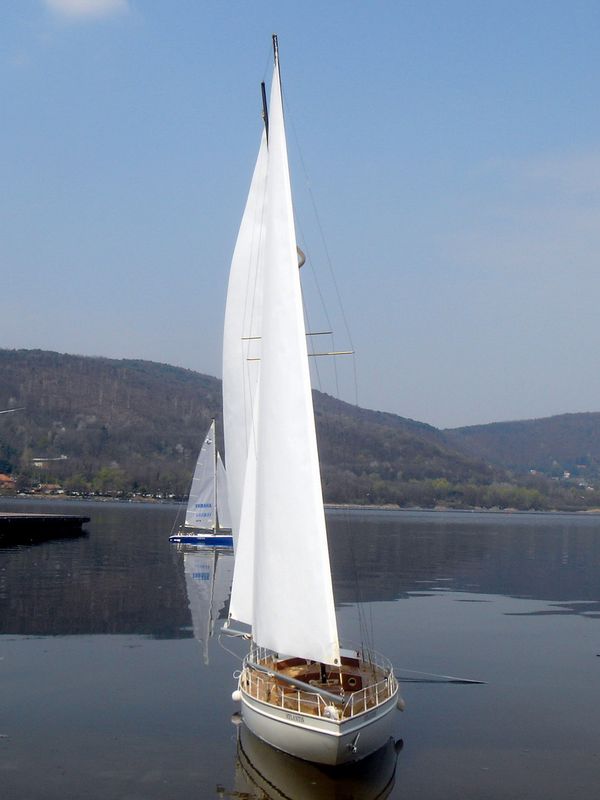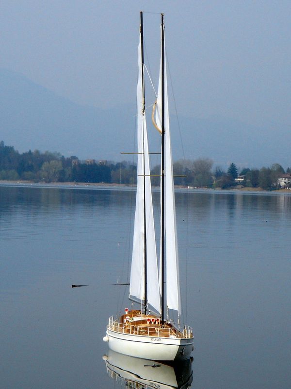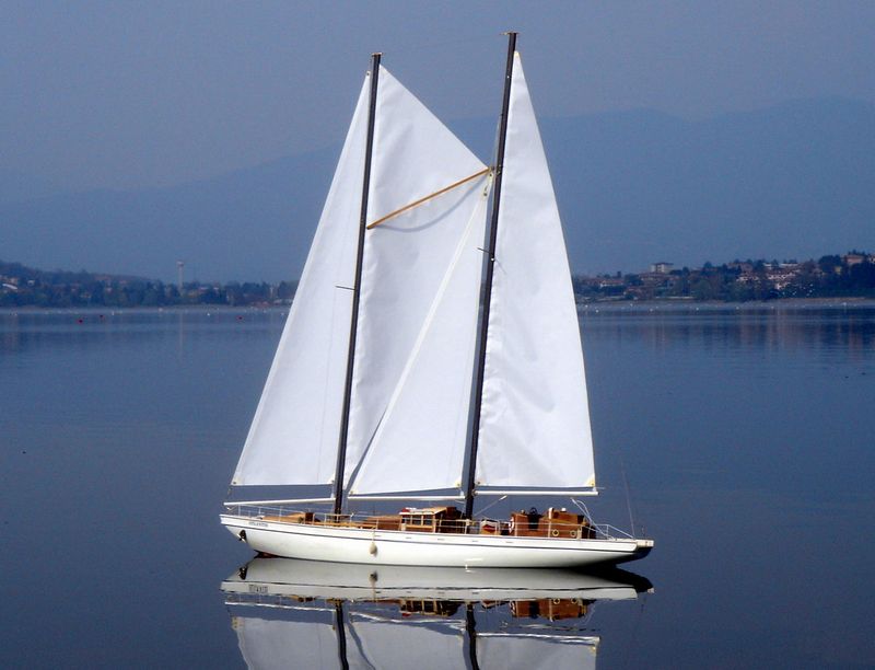 - Il modello è stato ricavato da scatola di montaggio della Graupner. Ha una superficie velica complessiva prossima al metro quadro, ripartita in più punti, e uno scafo aerodinamicamente modellato, che favoriscono una soddisfacente operabilità. La velatura ripartita consente una buona regolazione della rotta anche con venti di diversa intensità, grazie al recupero di ogni singola vela.