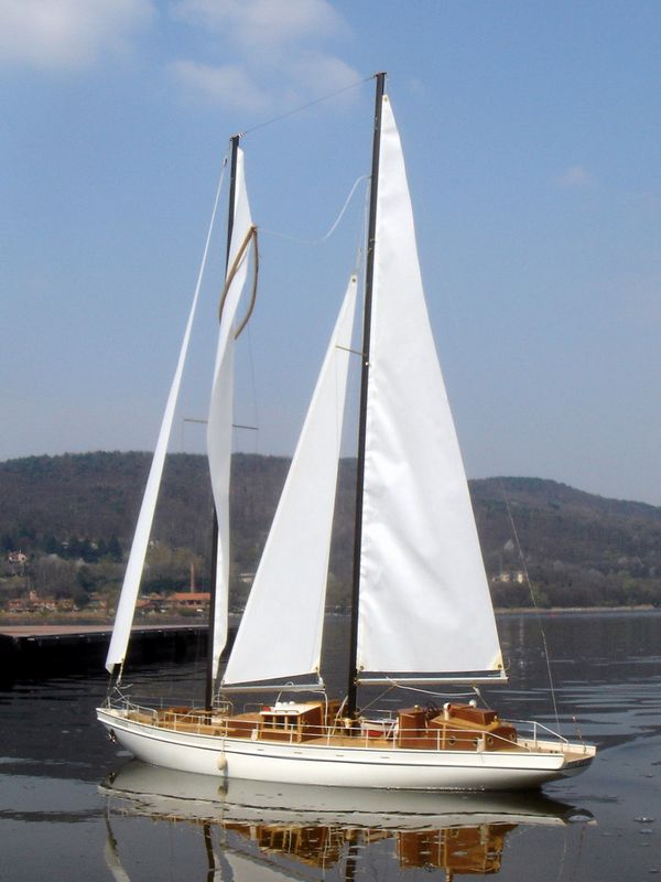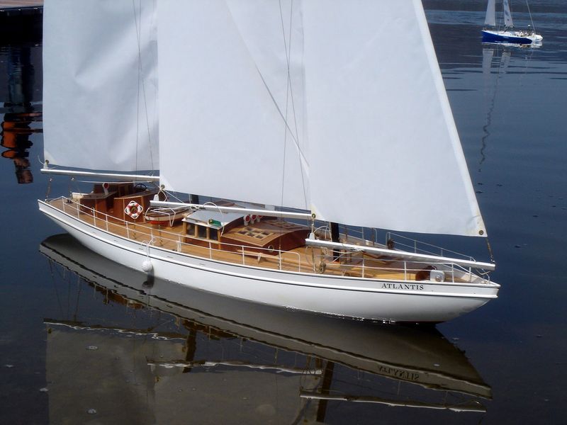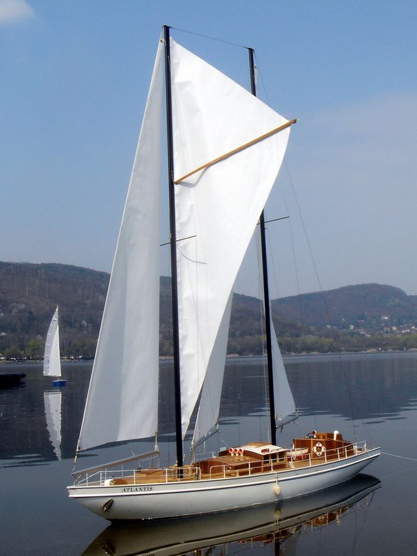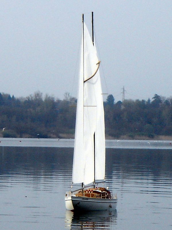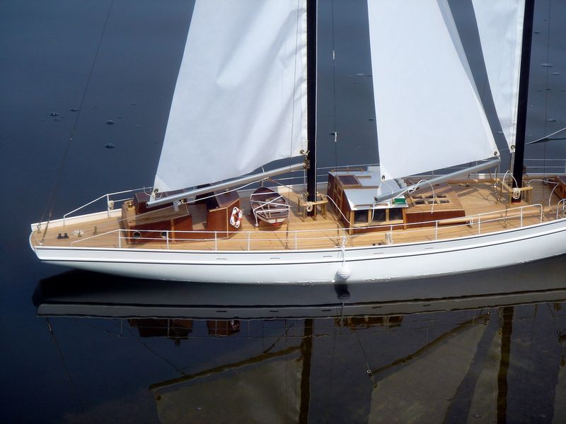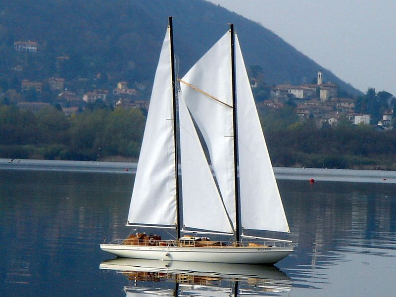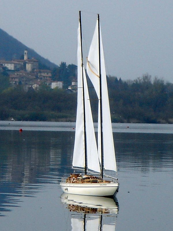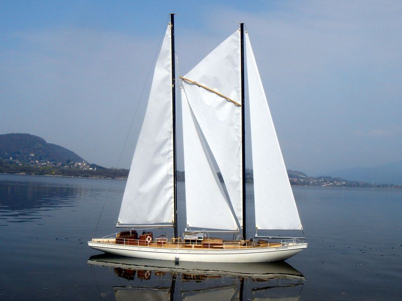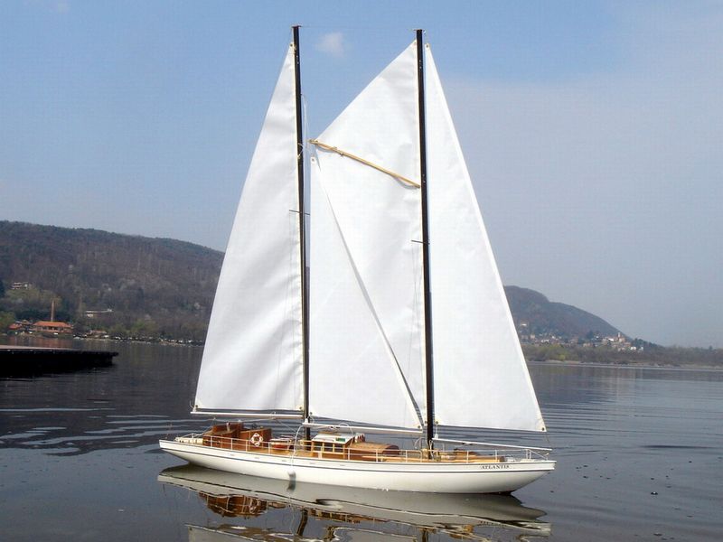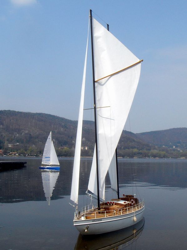 - Il modello è stato ricavato da scatola di montaggio della Graupner. Ha una superficie velica complessiva prossima al metro quadro, ripartita in più punti, e uno scafo aerodinamicamente modellato, che favoriscono una soddisfacente operabilità. La velatura ripartita consente una buona regolazione della rotta anche con venti di diversa intensità, grazie al recupero di ogni singola vela.