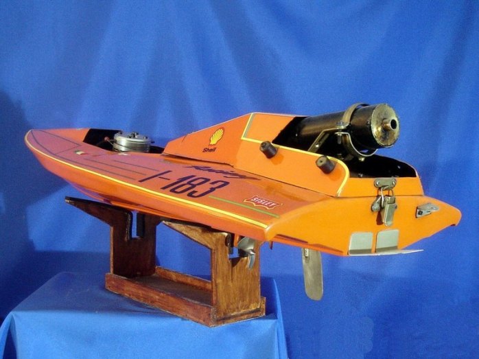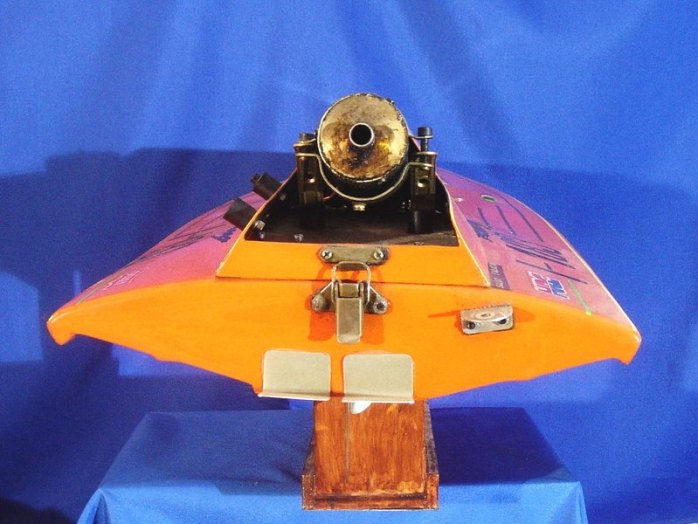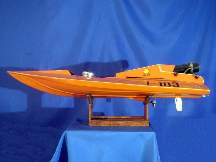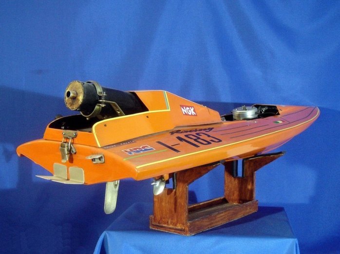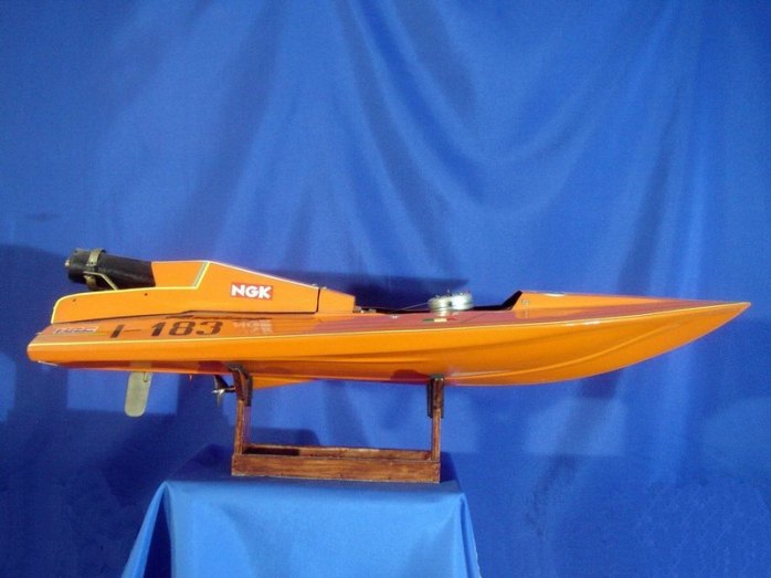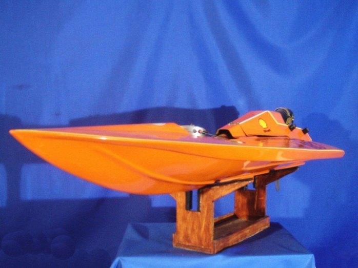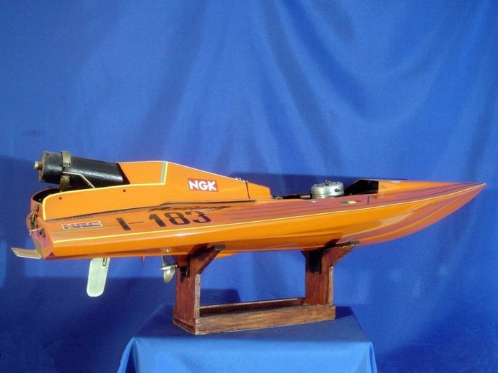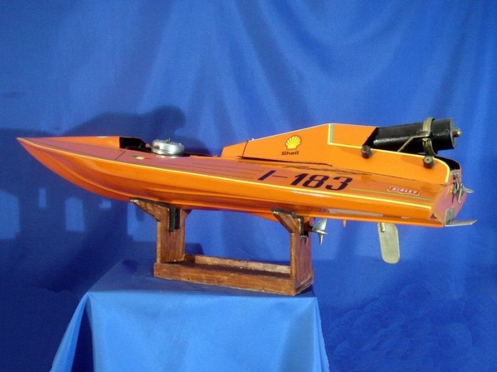 Scafo da competizione. Anno 1992; realizzato in VTR; numero di gara I-183 partecipante al Campionato Italiano anno 1993; categoria SUPER OVALE Motore CMB 15cc, potenza 5,5 CV; Vel. Max 85 km/h. Serbatoi in lamierino di rame autocostruiti da 1,4 litri complessivi. Consumo orario: 4litri / ora. N. 4 compartimenti stagni di cui n. 1 compartimento dedicato alla sala Radio. Miscela composta da Alcool Metilico; Olio di ricino e Nitrometano.