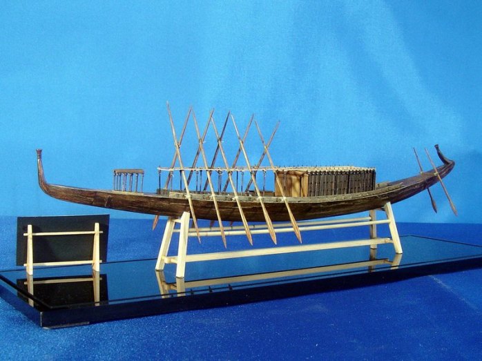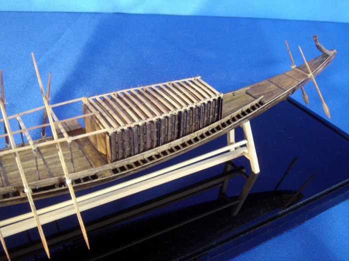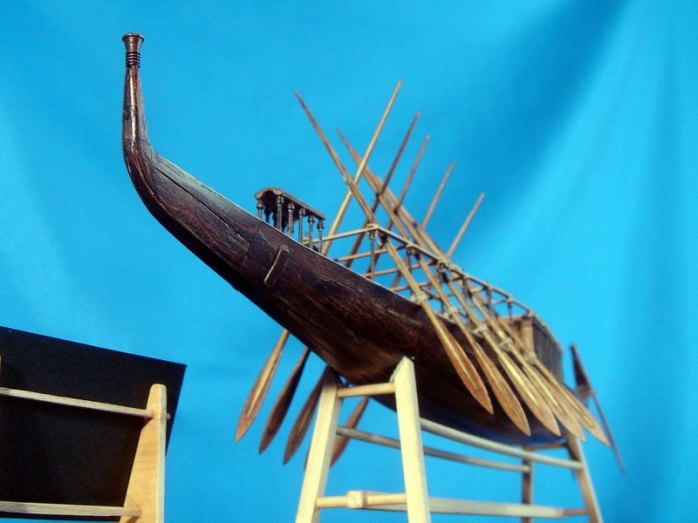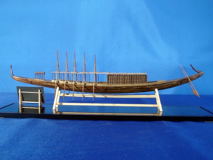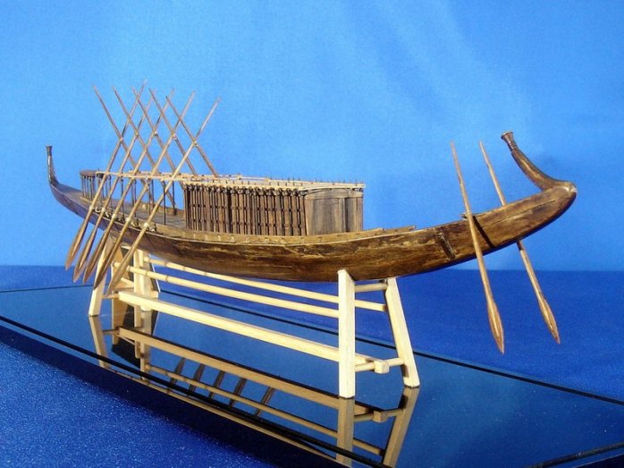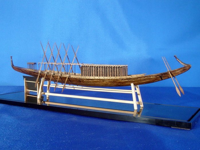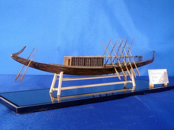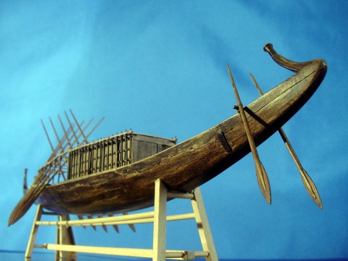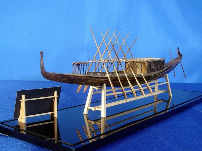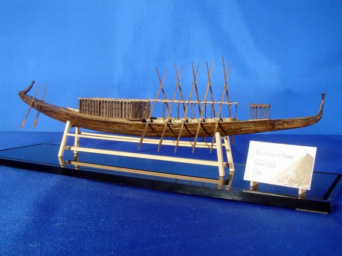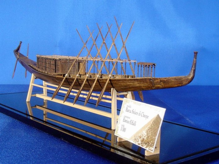 La barca solare venne riportata alla luce nel 1954 nel sito archeologico di Giza. Può essere ritenuta la nave più antica del mondo. E’ in ottimo stato di conservazione nonostante i 5000 anni trascorsi dall’ultima volta che è stata usata. Riposta smontata in una galleria a sud della Grande Piramide, venne certamente usata nella cerimonia funebre del Faraone Cheope. La “galleria” era ancora perfettamente sigillata e quando venne aperta si sentiva ancora il profumo del legno di cedro. Oltre al cedro sono stati usati sicomoro e giaggiolo. Prua e poppa terminano con pali a forma di papiro. Un’altra barca gemella, ma in condizioni meno buone come constatato alcuni anni fa, è ancora custodita nel luogo originario: si ritiene che venne danneggiata durante la costruzione dell’edificio destinato a ospitare la prima barca
