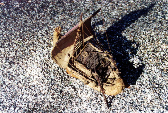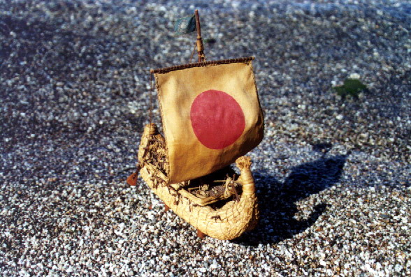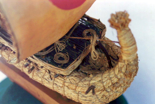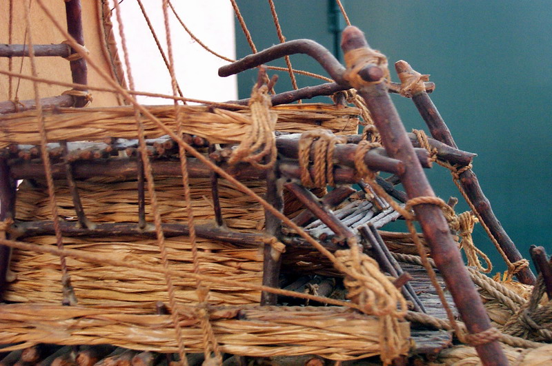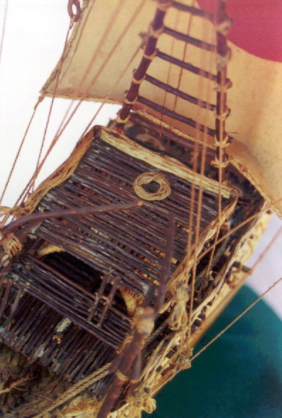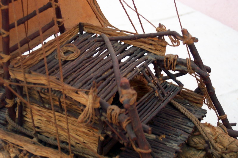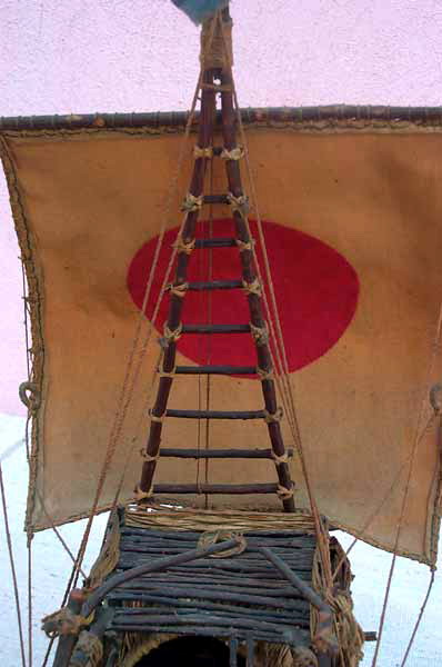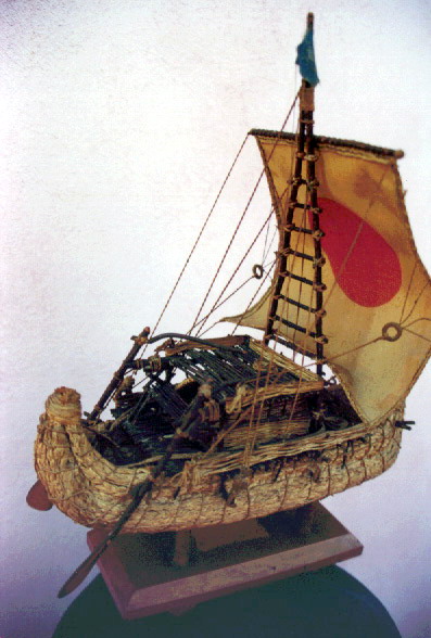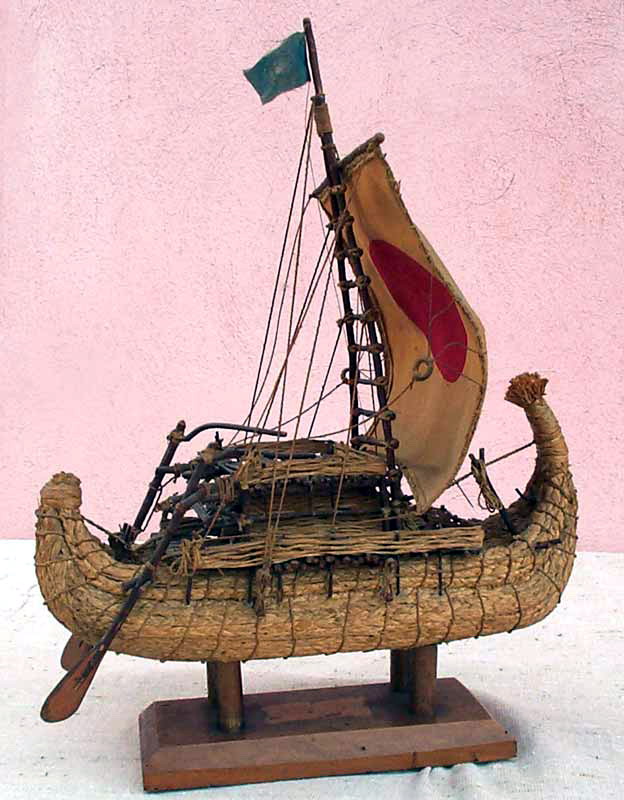 Il modello qui rappresentato è stato realizzato nel 1969 osservando le immagini fotografiche pubblicate dalla stampa dell’epoca subito dopo l’impresa. E’ costruito interamente in fibre vegetali intrecciate a mano. I colori usati per la decorazione della vela sono anch’essi di origine vegetale. Il cordame in canapa grezza. Un accurato restauro effettuato nel 1999 ha riconferito al modello l’aspetto l’originario senza l’aggiunta di alcun prodotto sintetico difforme allo spirito costruttivo del modellista.