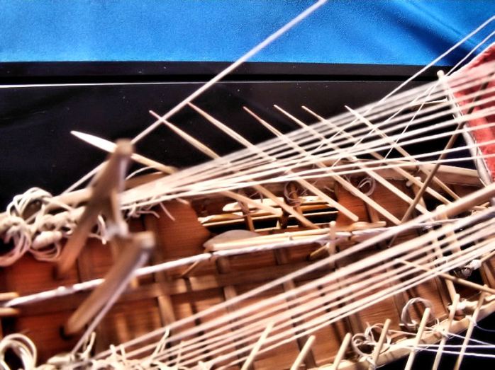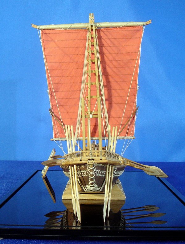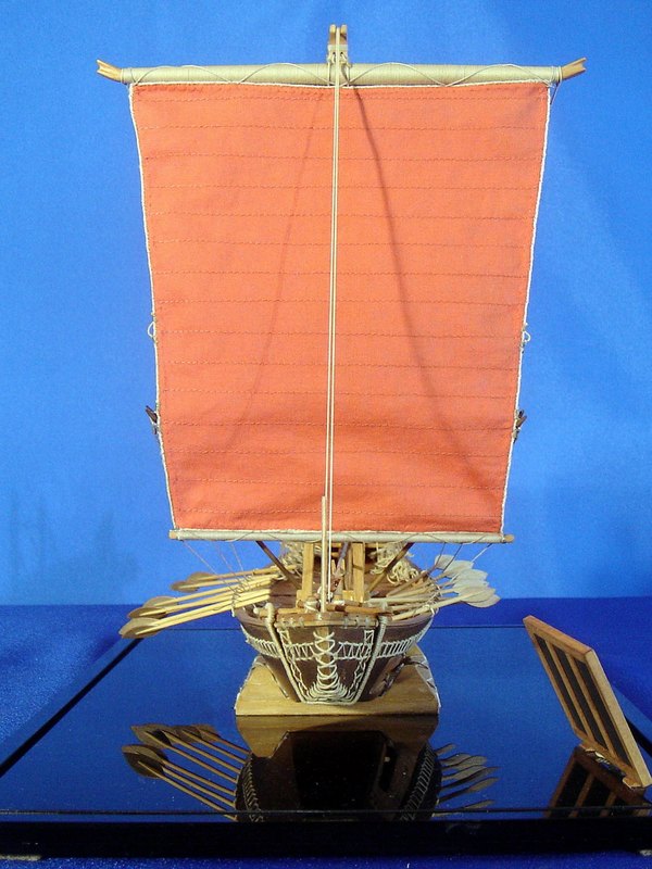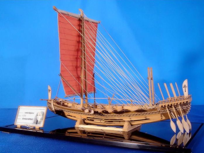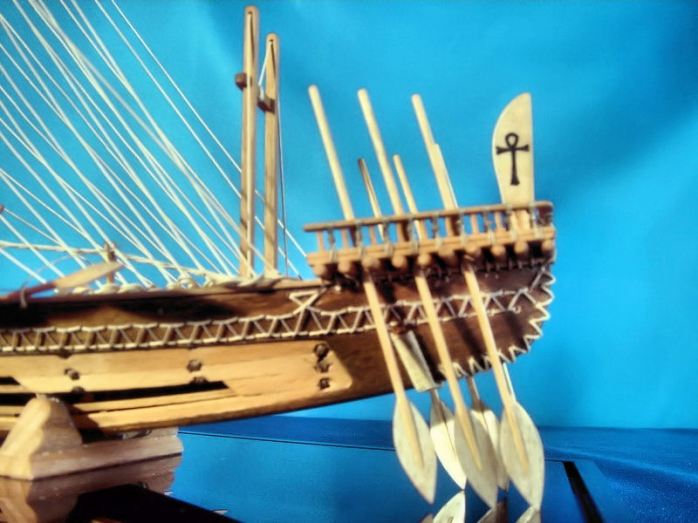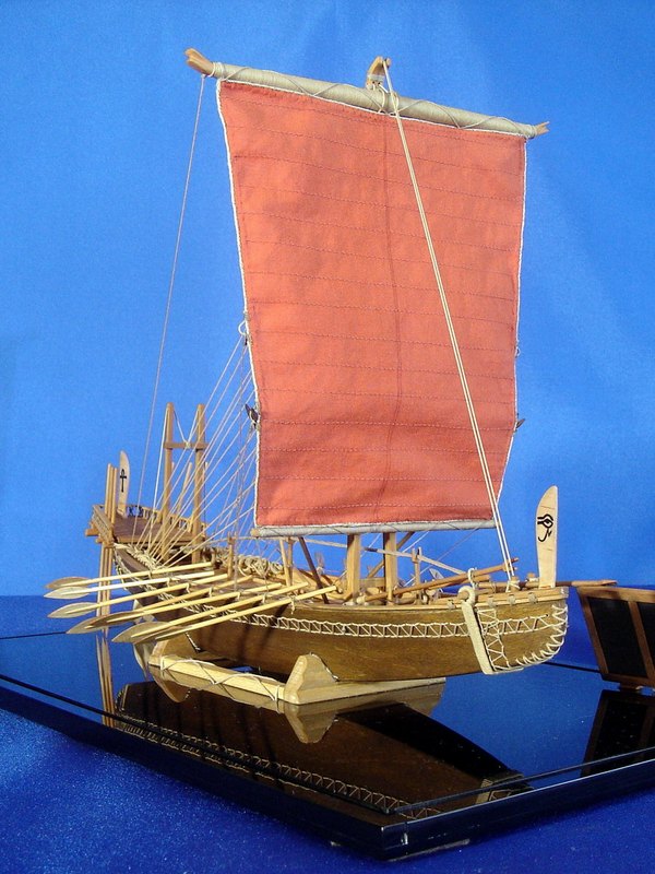 Questi modelli riproducono una nave egizia della 5a Dinastia utilizzata per il trasporto di materiale. Con imbarcazioni di questo tipo gli antichi egizi effettuavano trasporti lungo il fiume Nilo e si inoltravano in mare sia verso oriente che verso occidente senza mai, però, allontanarsi dalla costa. Per la propulsione utilizzavano una vela quadra e, in assenza di vento e per le manovre, usavano i remi. La direzione era assicurata dai remi sistemati a poppa. La particolare forma dell’albero era dovuta alla scarsa resistenza dello scafo che era privo della chiglia.