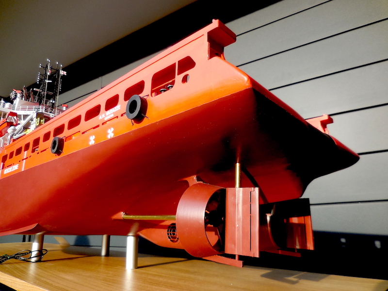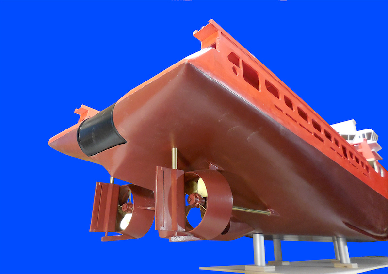 Il Varazze utilizza due eliche a passo variabile intubate. Dopo aver costruito il mozzo sono state realizzate, e montate, le quattro pale costruite con lamiera di ottone. Gli assi sono inseriti in astucci portaelica dotati di intercapedine come nei modelli naviganti. I timoni, con struttura interna in legno e rivestimento in lamiera di alluminio, sono compensati e dotati di una pala supplementare con funzioni di trim. I timoni sono collegati fra loro. L’albero che sostiene le antenne dei radar e i segnali è costituito da un traliccio complesso. Nel modello è realizzato con tubetti di ottone, di vari diametri, saldati a stagno. Il corretto posizionamento dei pezzi è stato ottenuto grazie a dime in compensato.