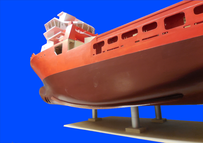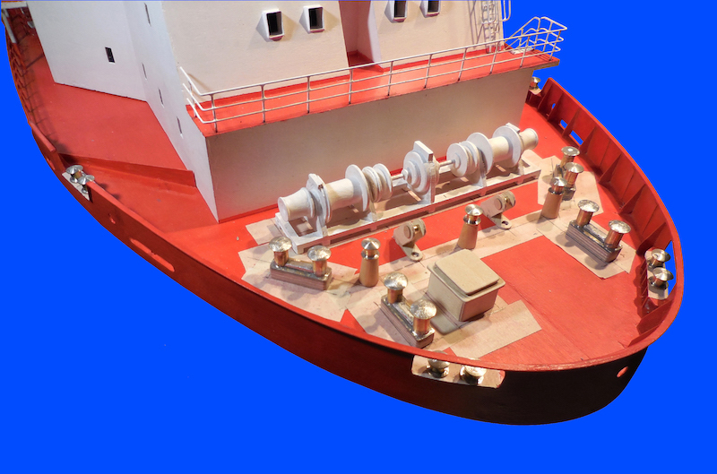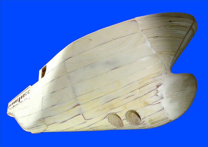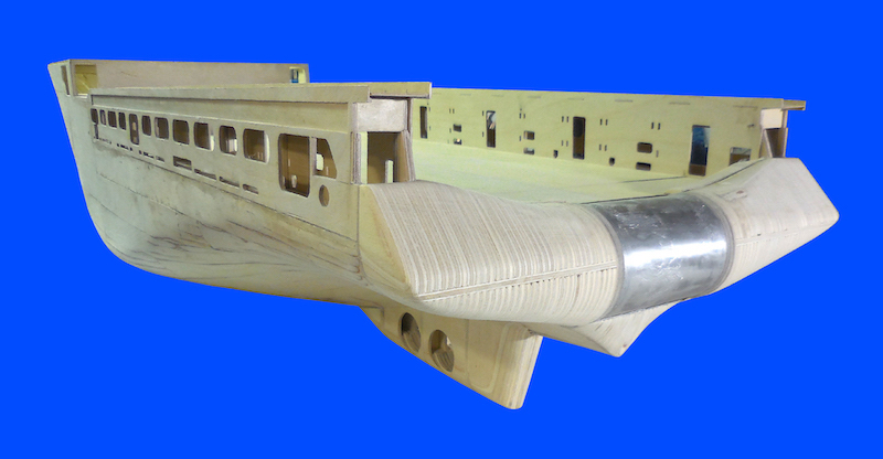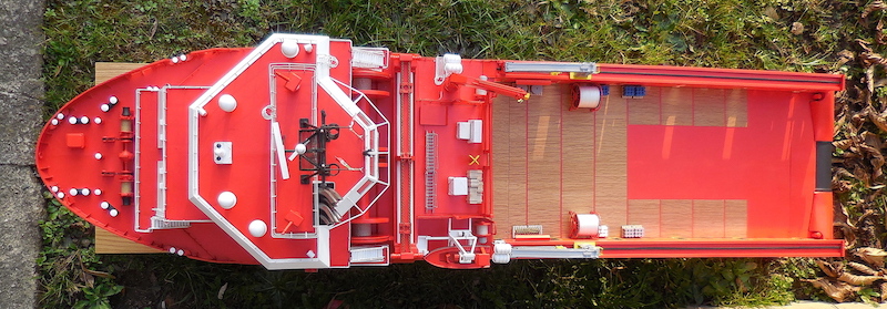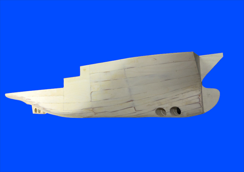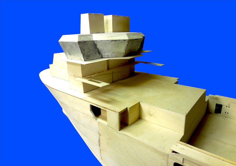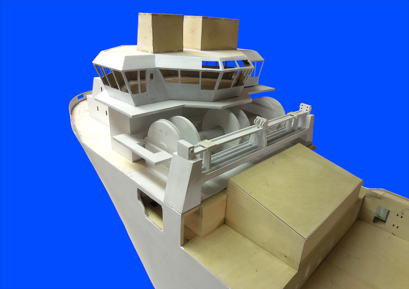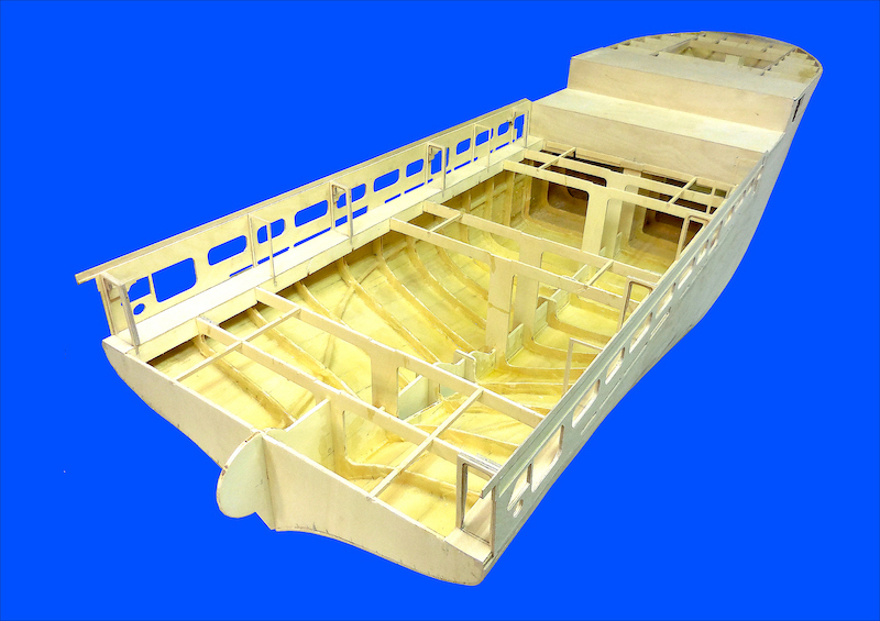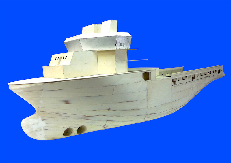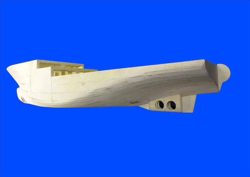 Dopo aver montato il fasciame è stato applicato, all’interno dello scafo, uno strato di resina per stabilizzare l’intera struttura. Il blocco di prua, con il grande bulbo, è stato realizzato in legno pieno incollando fra loro strati di compensato opportunamente sagomati. La stessa cosa è stata fatta per la chiglia che incorpora i due thruster poppieri. La tuga principale è stata realizzata costruendo, separatamente, le varie parti in modo da poterle rifinire con maggiore comodità e accuratezza.