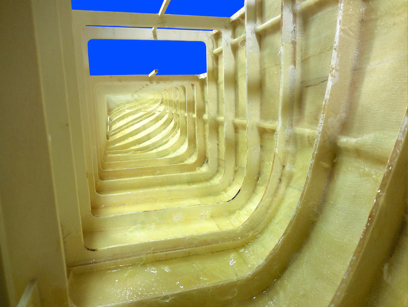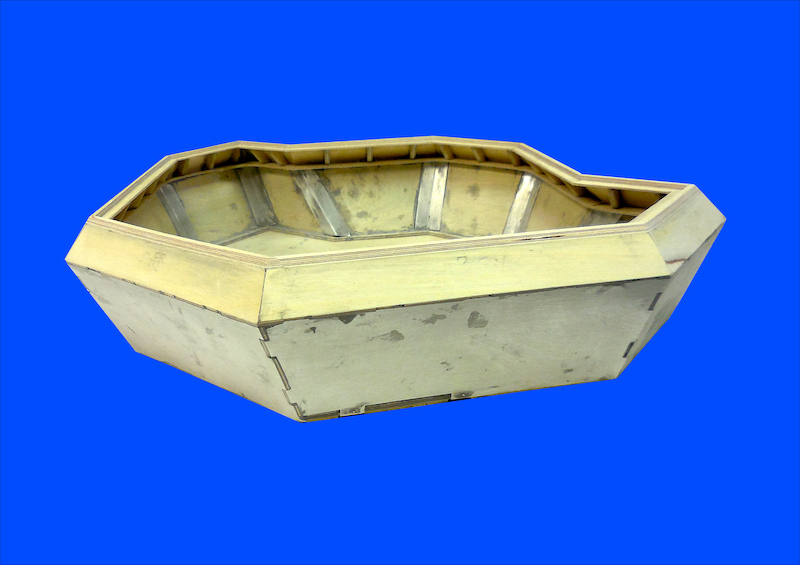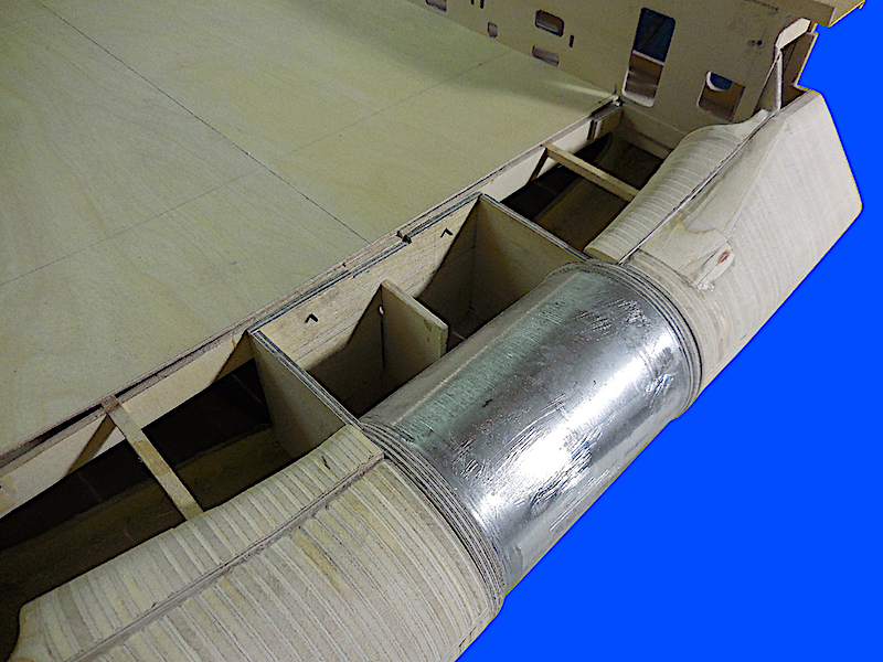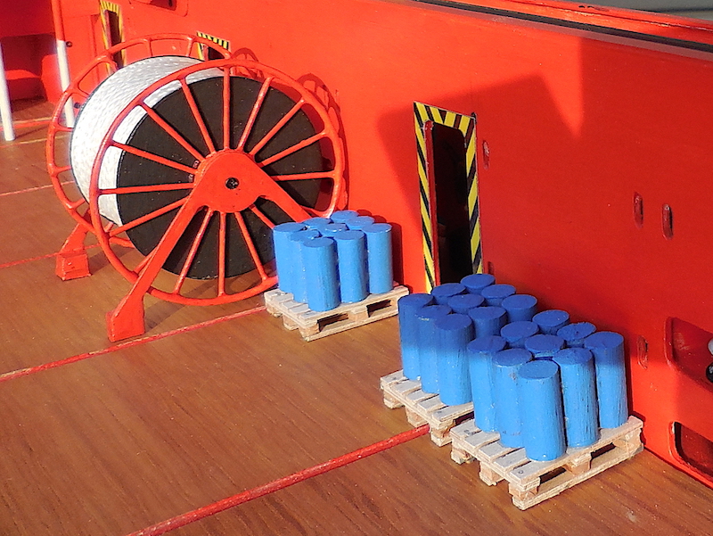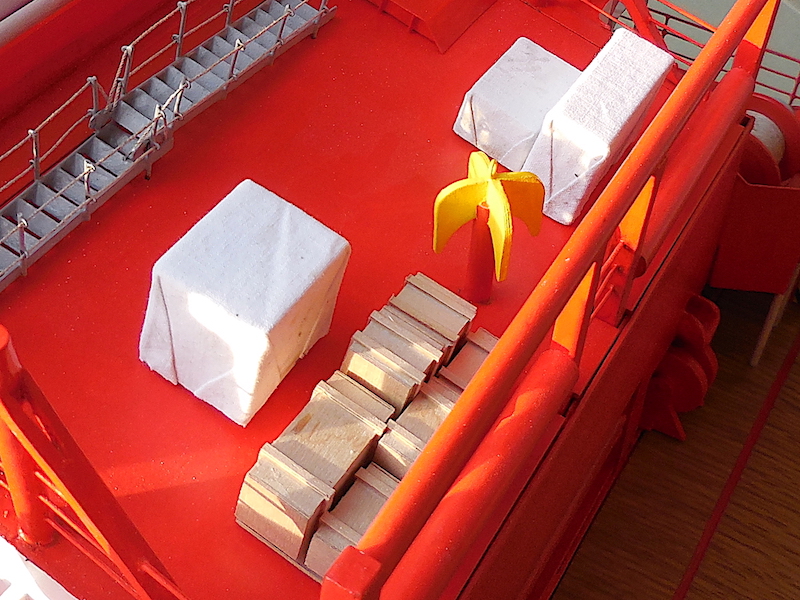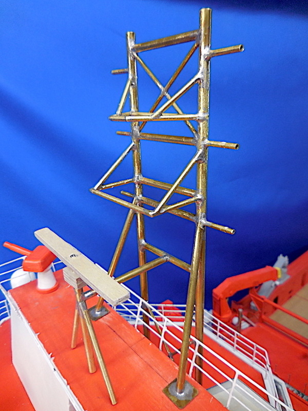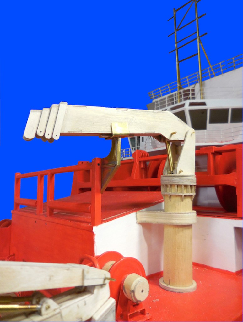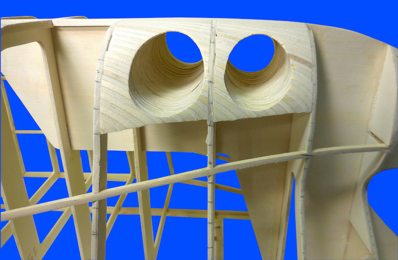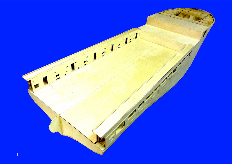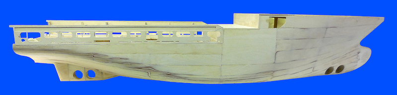 Dopo aver montato il fasciame è stato applicato, all’interno dello scafo, uno strato di resina per stabilizzare l’intera struttura. Il blocco di prua, con il grande bulbo, è stato realizzato in legno pieno incollando fra loro strati di compensato opportunamente sagomati. La stessa cosa è stata fatta per la chiglia che incorpora i due thruster poppieri. La tuga principale è stata realizzata costruendo, separatamente, le varie parti in modo da poterle rifinire con maggiore comodità e accuratezza.
