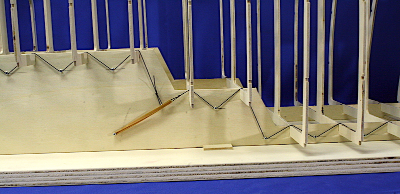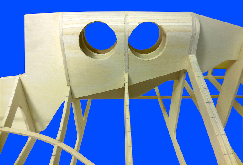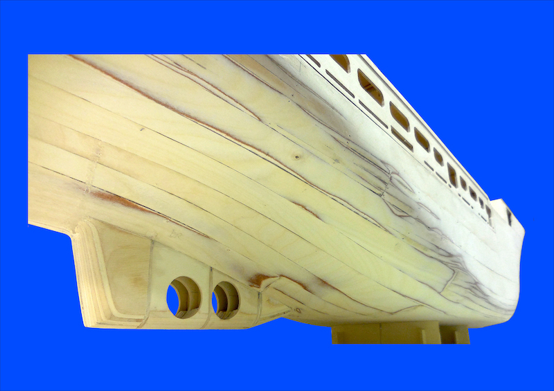 I vari componenti sono stati fissati ad un apposito sostegno atto a garantire il corretto allineamento di tutte le parti. Dopo aver fissato la chiglia alle ordinate, sono stati applicati i listelli longitudinali che irrigidiscono l’intera struttura ed è stato applicato il fasciame. E’ stato utilizzato compensato di betulla dello spessore di 1,5 mm. che, tagliato nelle forme più opportune, è stato applicato alle ordinate con colla vinilica.