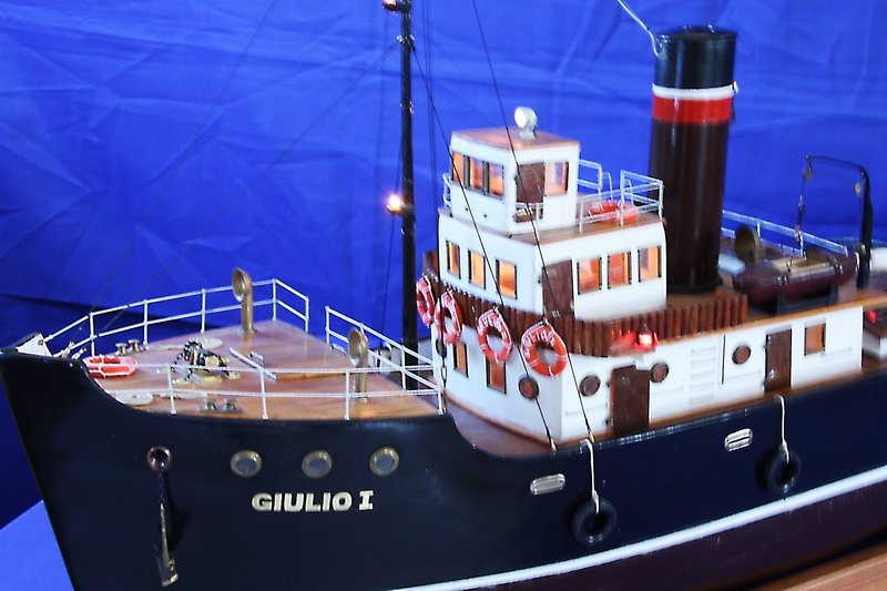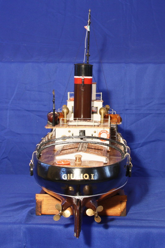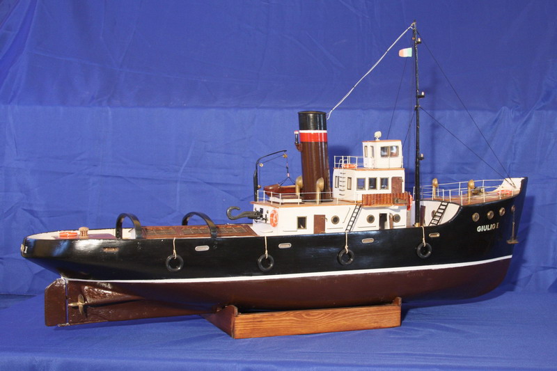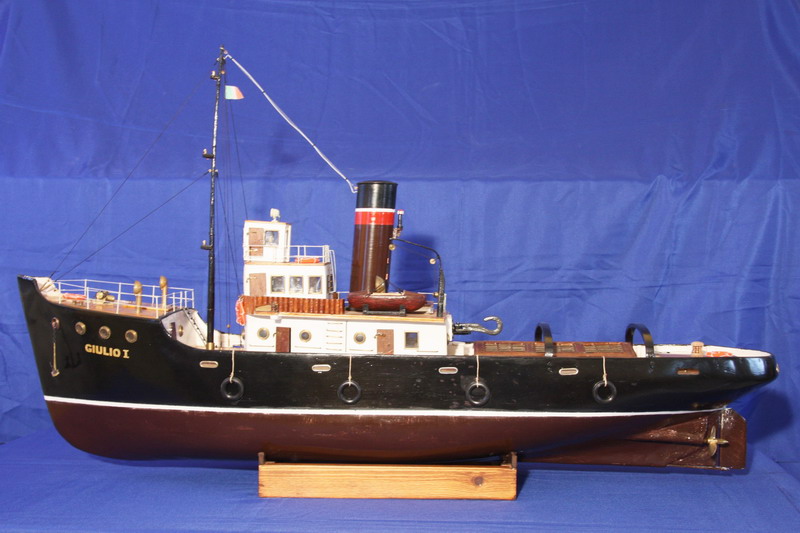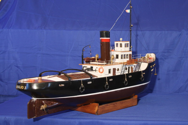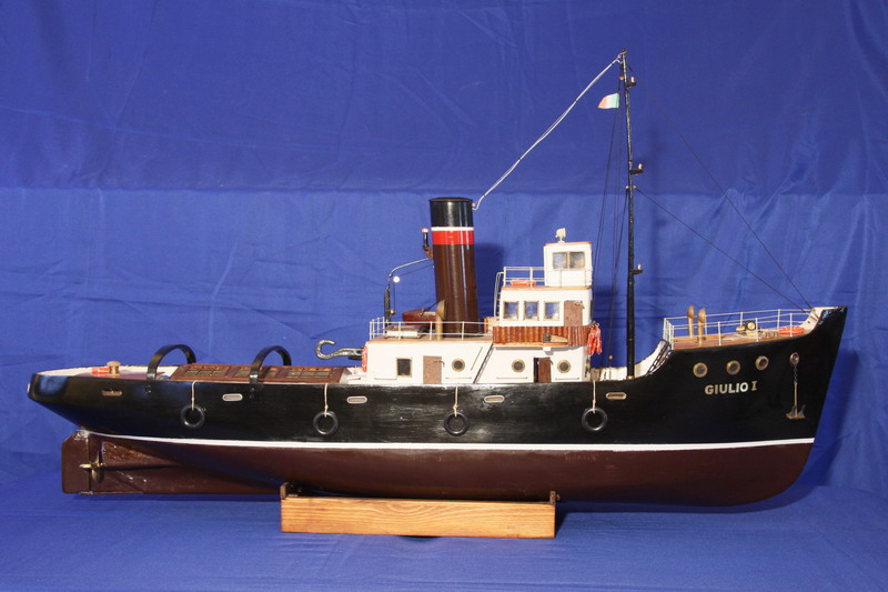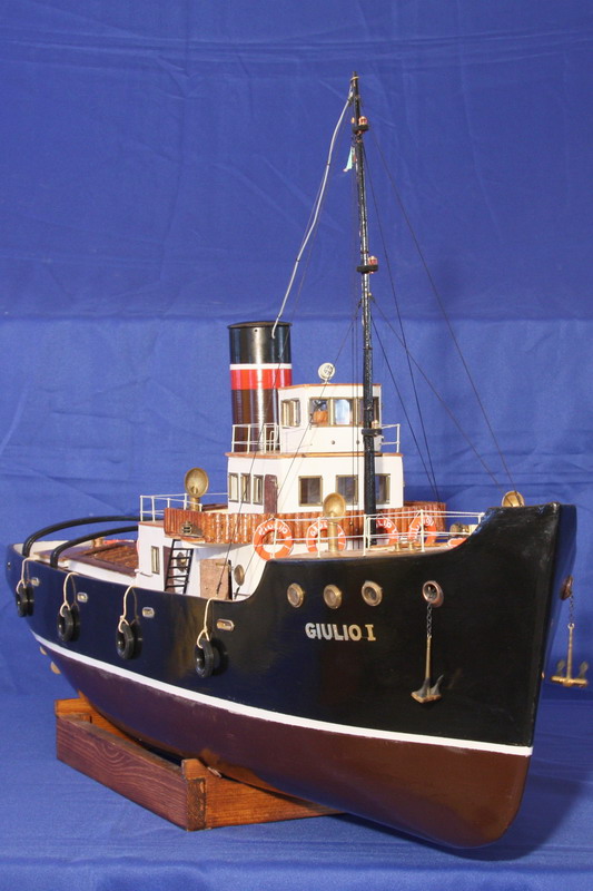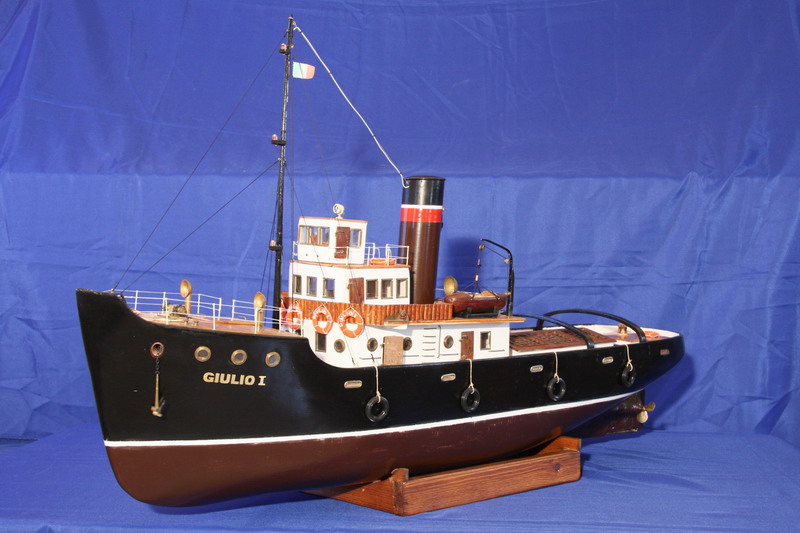 Il modello, battezzato Giulio I dal suo costruttore, non ha alcun riferimento storico. E’ stato auto costruito in base ai disegni di un rimorchiatore commercializzato in scatola di montaggio negli anni 70 dalla ditta MOVO di Milano con il nome di fantasia di “Muimota”. La scala riportata sul disegno è presumibilmente in accordo con le dimensioni medie dei rimorchiatori d’alto mare dell’epoca. Lo scafo, realizzato con ordinate in compensato e fasciame con listelli di tiglio, è impermeabilizzato all’interno con lana di vetro, impregnata con resina epossidica a due componenti. Le sovrastrutture sono in compensato e gli accessori in ottone. Il ponte e i piani di calpestio sono rivestiti con listelli di noce. Il modello è dotato delle luci di posizione e dell’illuminazione del quadrato ufficiali e della cabina di pilotaggio. Il modello è navigante e radiocomandato, con un peso di 18 kg a vuoto e 22 kg in navigazione, la propulsione è prodotta da due eliche controrotanti. Nella soluzione attuale esse sono azionate, tramite cinghia di trasmissione, da un singolo motore collegato a una batteria al Pb da 12 V e 7 Ah, che alimenta anche l’illuminazione. E’ prevista l’adozione di due motori, uno per linea d’asse, comandabili indipendentemente.