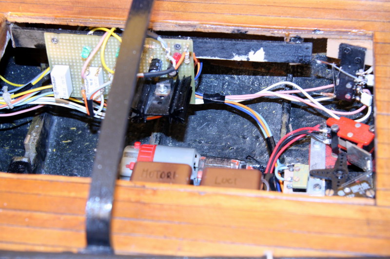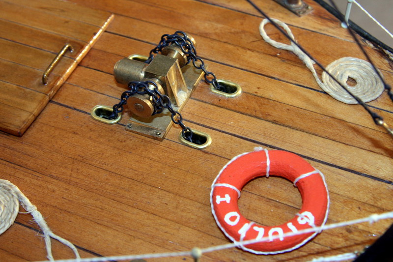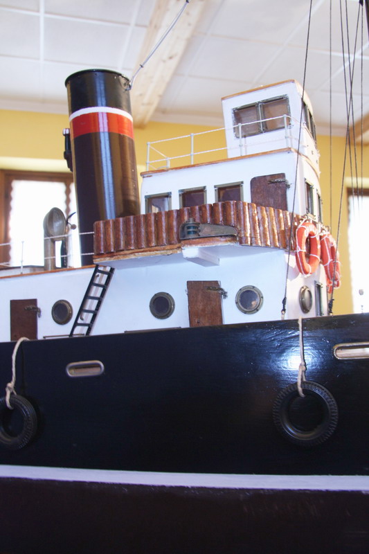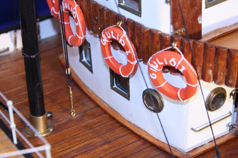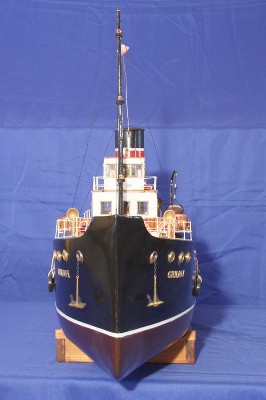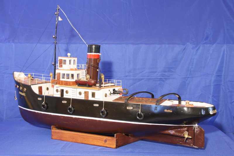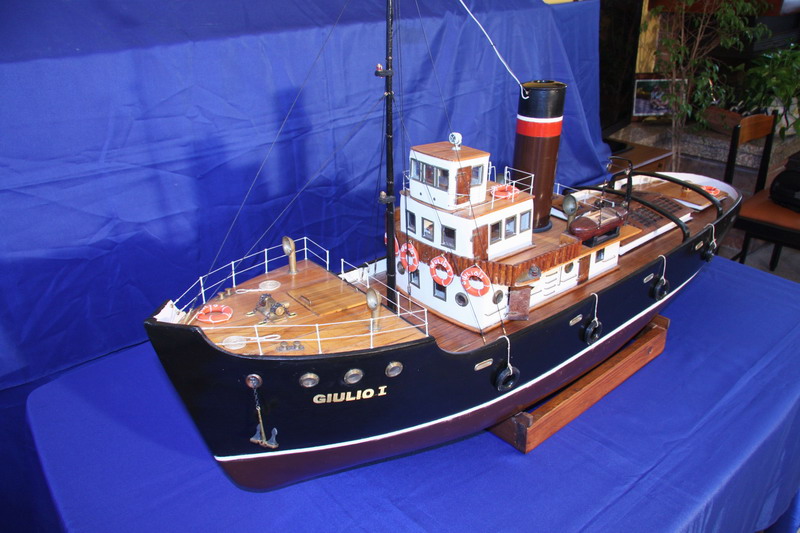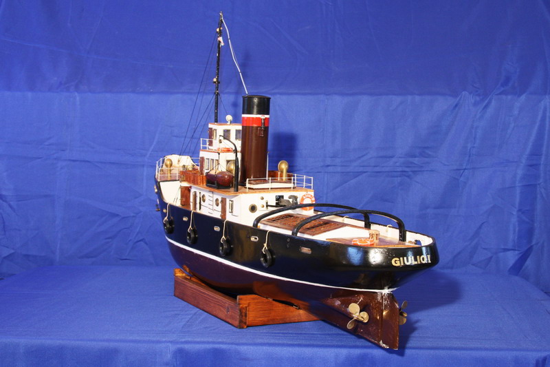 Il modello, battezzato Giulio I dal suo costruttore, non ha alcun riferimento storico. E’ stato auto costruito in base ai disegni di un rimorchiatore commercializzato in scatola di montaggio negli anni 70 dalla ditta MOVO di Milano con il nome di fantasia di “Muimota”. La scala riportata sul disegno è presumibilmente in accordo con le dimensioni medie dei rimorchiatori d’alto mare dell’epoca. Lo scafo, realizzato con ordinate in compensato e fasciame con listelli di tiglio, è impermeabilizzato all’interno con lana di vetro, impregnata con resina epossidica a due componenti. Le sovrastrutture sono in compensato e gli accessori in ottone. Il ponte e i piani di calpestio sono rivestiti con listelli di noce. Il modello è dotato delle luci di posizione e dell’illuminazione del quadrato ufficiali e della cabina di pilotaggio. Il modello è navigante e radiocomandato, con un peso di 18 kg a vuoto e 22 kg in navigazione, la propulsione è prodotta da due eliche controrotanti. Nella soluzione attuale esse sono azionate, tramite cinghia di trasmissione, da un singolo motore collegato a una batteria al Pb da 12 V e 7 Ah, che alimenta anche l’illuminazione. E’ prevista l’adozione di due motori, uno per linea d’asse, comandabili indipendentemente.