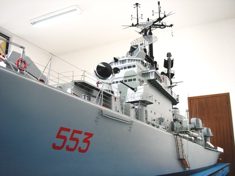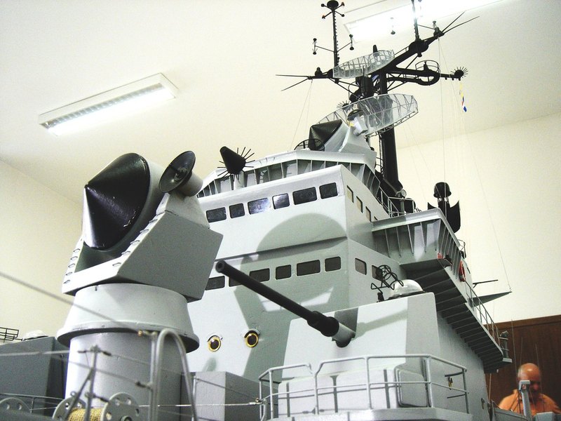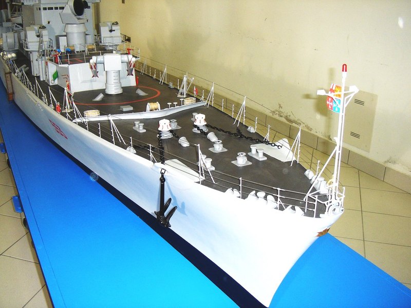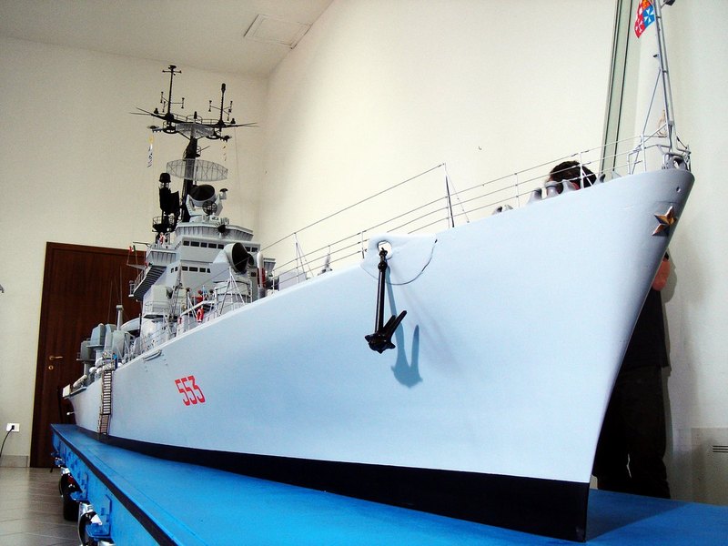 L’Andrea Doria, costruzione 553, era una unità della classe Caio Duilio, classe di due navi: l’Andrea Doria, appunto, e la gemella Caio Duilio, costruzione 554, che ha dato il nome alla classe nonostante sia stata costruita successivamente. Queste due navi costituivano le unità di nuova concezione realizzate per assicurare scorta con protezione antiaerea e antisommergibile a formazioni navali e furono in questo senso il risultato di una indiscussa nuova fiducia della N.A.T.O. alle istituzioni italiane durante il periodo della guerra fredda tra il blocco occidentale e quello sovietico. Sebbene sufficienti ad assicurare una cooperazione con le forze multinazionali della N.A.T.O. Le unità italiane erano carenti sui sistemi di comando e controllo automatizzati. Le due unità della classe Caio Duilio vennero quindi ammodernate con l’installazione dei primi sistemi automatici di direzione delle operazioni di combattimento. (S.A.D.O.C. – 1). L’attività dell’Andrea Doria fu molto intensa e ricca di eventi. Varata il 27 febbraio 1963, ebbe come madrina la Signora Teresa Cavagnari, vedova dell’Ammiraglio d’Armata Domenico Cavagnari. Ricevuta la bandiera di combattimento dall’Ammiraglio Mario Bussola in nome del personale della precedente unità Andrea Doria il 3 agosto 1964, dopo il primo lancio sperimentale di missili, prese il mare per una campagna addestrativa in estremo oriente, in occasione delle Olimpiadi di Tokio, rientrando il 5 dicembre dopo aver percorso 22.294 miglia al comando del Capitano di vascello Giuseppe Galluccio. Successivamente effettuò un’altra crociera addestrativa di 13.010 miglia in Sud America al comando del Capitano di vascello Claudio Celli. Quindi fu destinata a Taranto il 19 gennaio 1965. Da allora compì numerose e svariate missioni insieme al comando interforze del Mediterraneo, in particolare si distinse nell’esercitazione Iles d’Or del 1973 che le fece meritare il titolo di “Nave dell’Anno”. Dal 1976 al 1978 fu fermata per lavori di conversione dell’apparato motore da nafta a gasolio e venne inoltre standardizzato il sistema di puntamento dei missili. Alla fine del 1978 fu di nuovo in oriente con le navi Vittorio Veneto e Stromboli per una missione umanitaria in favore dei profughi vietnamiti (si era in piena guerra tra americani e vietcong) e nel 1980 partecipò alle operazioni di ricerca ed identificazione del relitto del DC-9 dell’Itavia, inabissatosi nelle acque tra Ponza ed Ustica. Infine il 29 novembre di quello stesso anno attracca nel golfo di Napoli per soccorrere le popolazioni colpite dal terremoto dell’Irpinia. Trasferita come base da La Spezia a Taranto nel 1984, assume il compito di sede del comando della 2° Divisione Navale, partecipando alle missioni operative Libano 2 in supporto logistico al contingente terrestre inquadrato nella Forza Multinazionale di Pace. Nel 1986 partecipa all’operazione Girasole nell’ambito della crisi italo – libica di quell’anno. L’11 settembre 1992 vede l’ultima uscita in mare dell’Andrea Doria con a bordo lo staff della 2° Divisione Navale e al ritorno cominciano le procedure di messa in disarmo con un totale di 577.000 miglia percorse in tutti i mari del mondo.