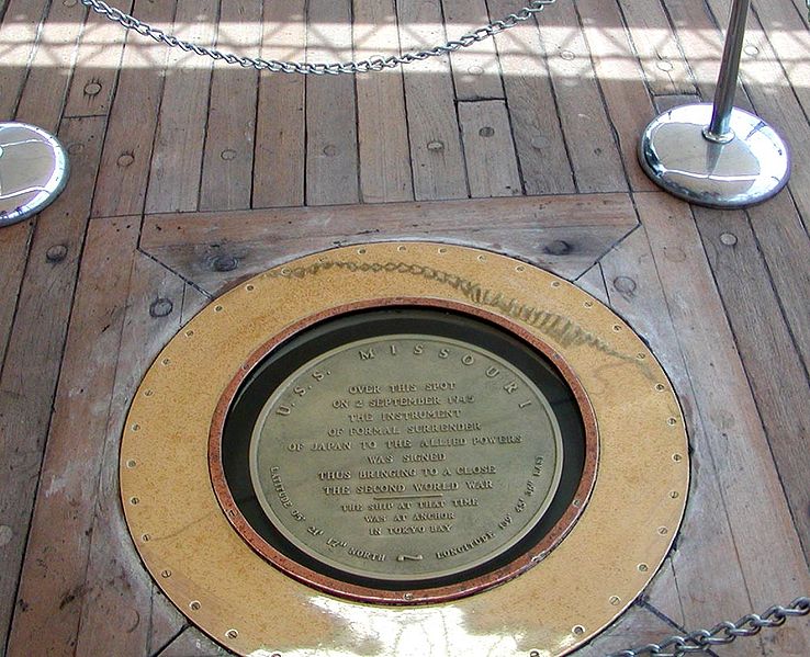 La USS Missouri, nave corazzata degli Stati uniti d’America, è stata la terza unità delle quattro costituenti la classe Jowa. Varata nel gennaio 1944 è stata completata nel giugno dello stesso anno. Sulla coperta di questa nave, il 2 settembre 1945 fu firmata la resa del Giappone. E’ stata l’unica corazzata presente sul teatro di guerra in Corea (1950-1953). Messa in riserva nel 1955, venne richiamata in servizio nel 1986 e partecipò alla prima Guerra del Golfo. Cessato il servizio nel 1992, dal 1998 è ancorata nel porto di Pearl Harbour dove è adibita a museo.