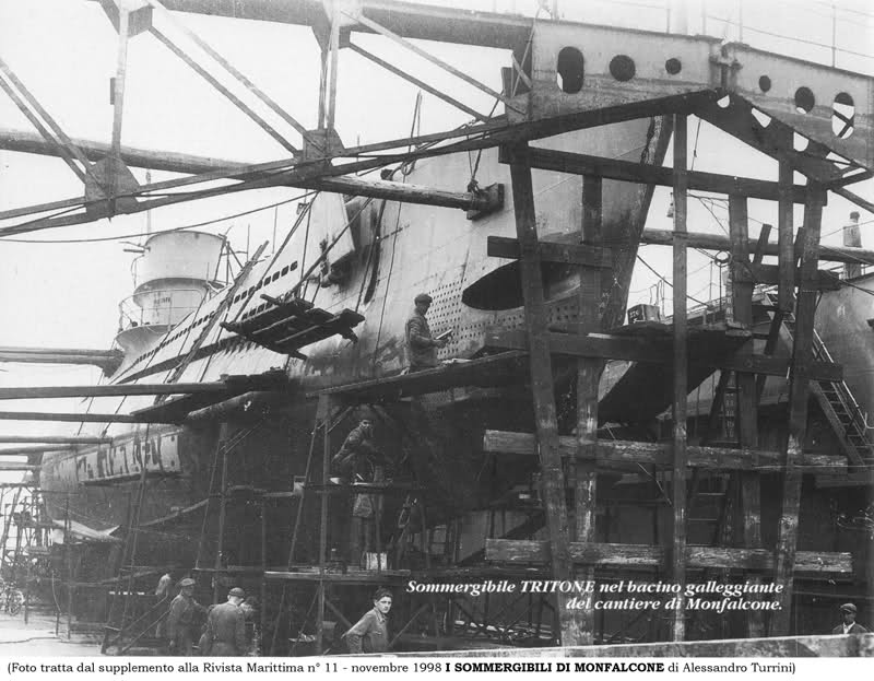La classe Tritone, a volte denominata anche Classe Flutto, fu un tipo di sommergili della Regia Marina, costruiti durante la seconda guerra mondiale per supplire alla mancanza sempre più grave di sommergibili da impiegare nel Mediterraneo. Questa classe di sommergibili era sostanzialmente uguale all’Argo, con l’introduzione di alcune migliorie, come dei motori diesel più potenti ed una maggiore autonomia. Costruito nei cantieri CRDA di Monfalcone, impostato il 15 maggio 1941, varato l’3 gennaio 1942 ed entrato in servizio il 10 ottobre 1942, venne affondato durante la sua prima missione il 19 gennaio 1943. Nel tentativo di attaccare alcune navi mercantili di un convoglio, intercettato da unità antisommergibili canadesi: Antelope, Port Arthur venne attaccato con bombe di profondità. Lo scafo del Tritone fu gravemente danneggiato, ed il Comandante ordinò di riemergere ed abbandonare il sommergibile. Una volta riemerso venne cannoneggiato dalle unità britanniche affondando rapidamente. Solo 25 uomini dell’equipaggio vennero raccolti dalle unità britanniche, mentre altri 26 morirono o rimasero dispersi, tra cui un meccanico civile, che era a bordo per l’ultima messa a punto.