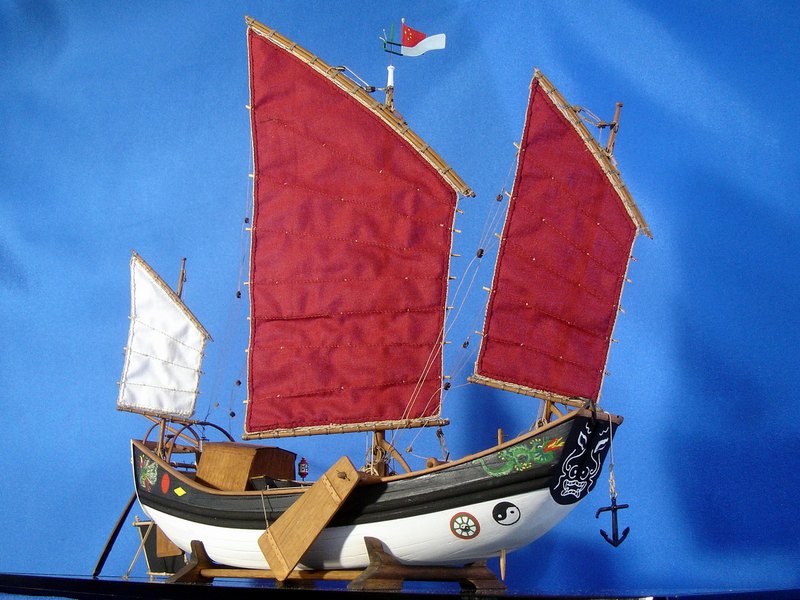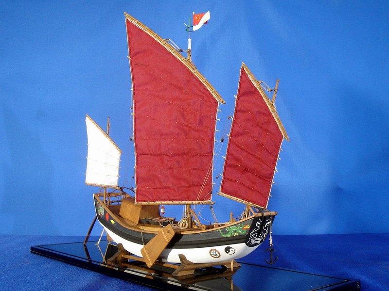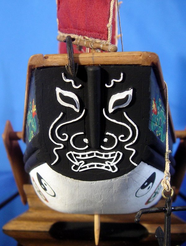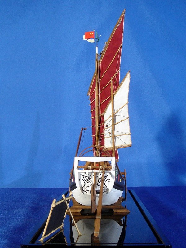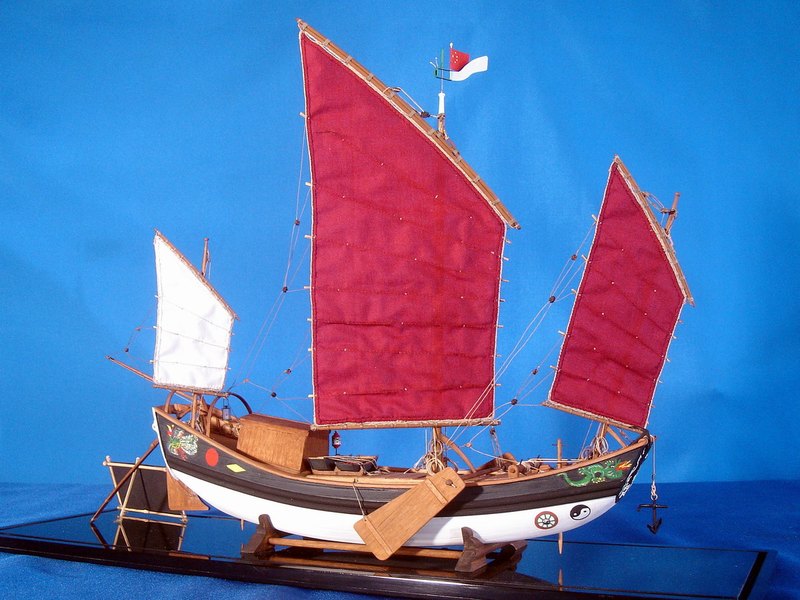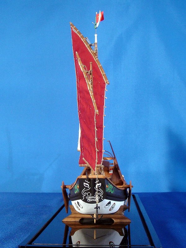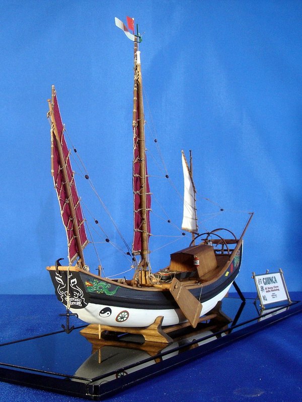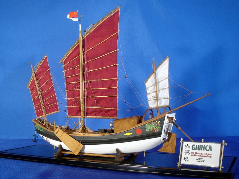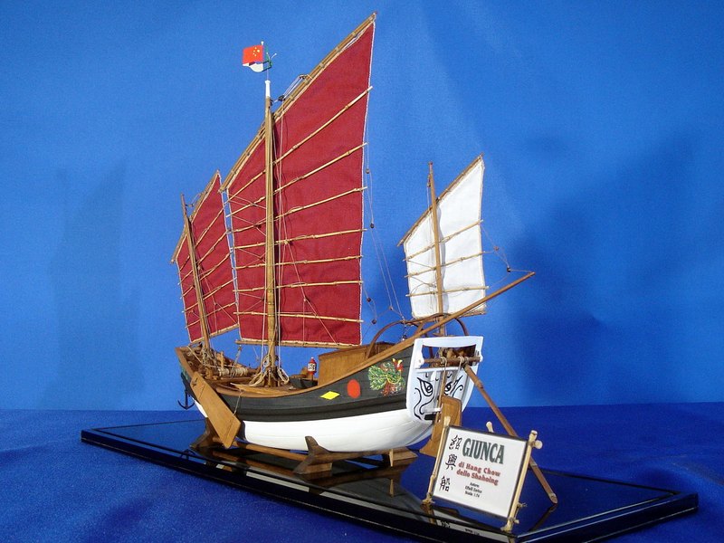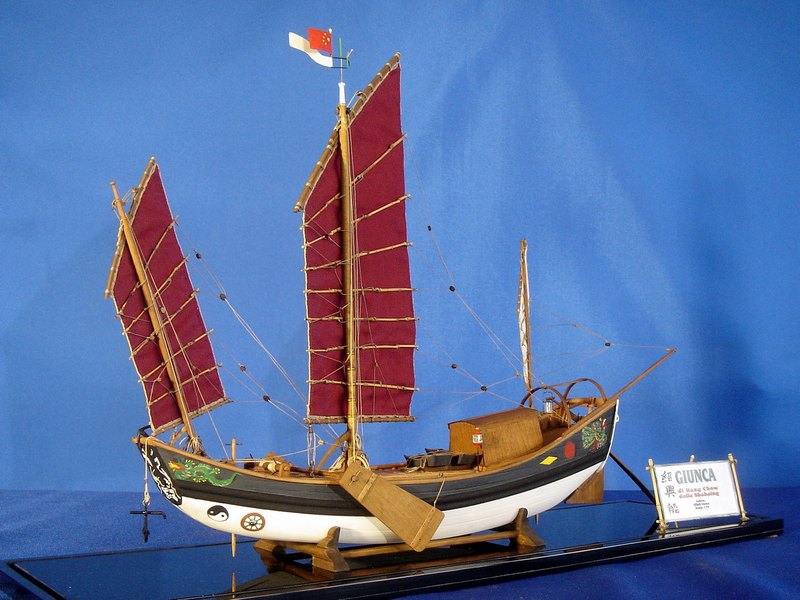 Giunca ideata per la navigazione costiera e fluviale , come quelle che si possono vedere nella baia di Hang Tcheon , fino all’imboccatura dello Yang Tse. Sono adibite al trasporto di merci leggere, come piante medicinali, ma anche per il trasporto di cotone e carbone . Vengono pure impiegate nella pesca. La loro lunghezza varia dai 20 ai 30 metri e hanno un’ampia velatura distribuita su due o tre alberi. Vengono governate con un timone e due derive laterali allo scafo. La bellezza dell’imbarcazione riprodotta dal modello è data soprattutto dai dipinti che la ornano. A prua e a poppa sono dipinte due maschere , di cui una in rilievo. Sulle fiancate sono dipinti il drago, simbolo tipico delle regine, ed il bene e il male, simbolo di protezione. Infine, a poppa è dipinta la fenice, simbolo propiziatorio.