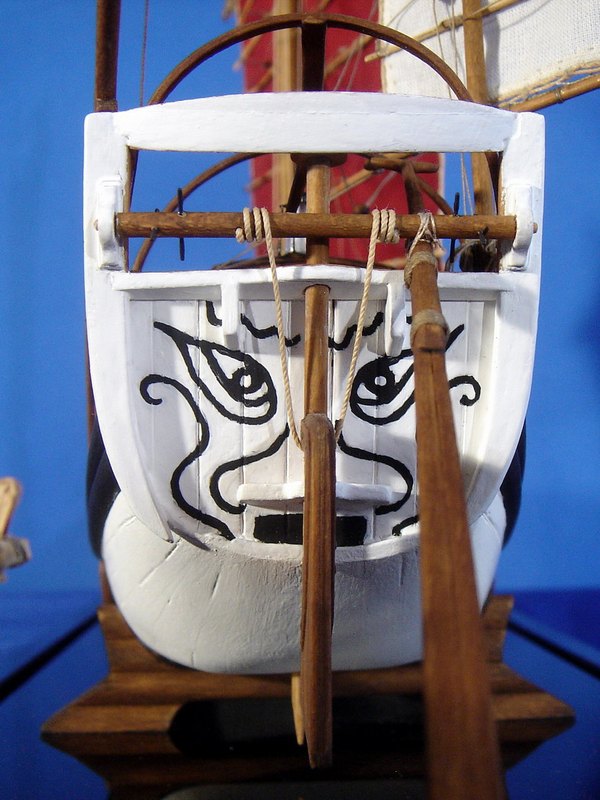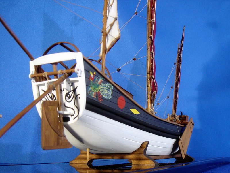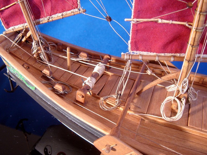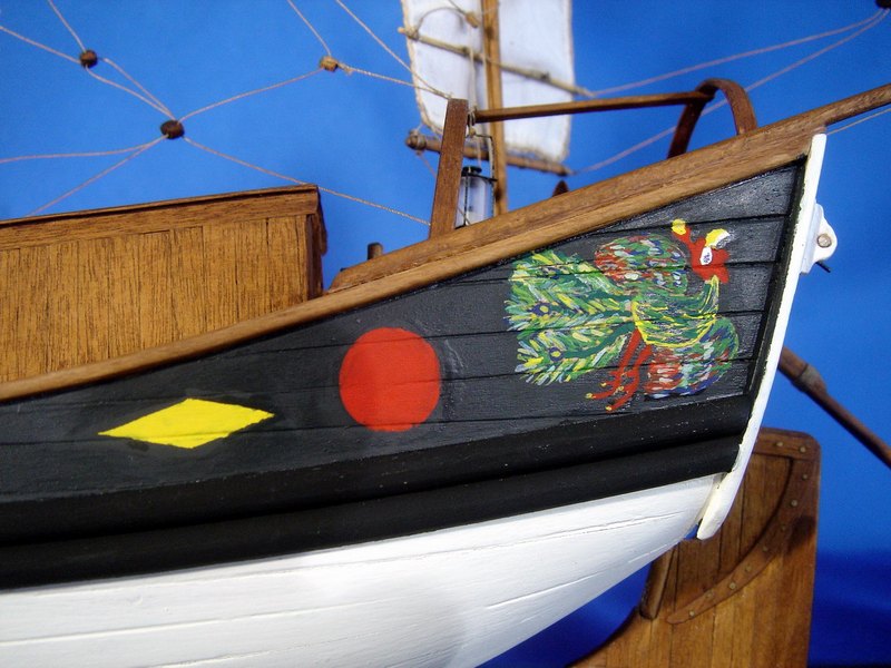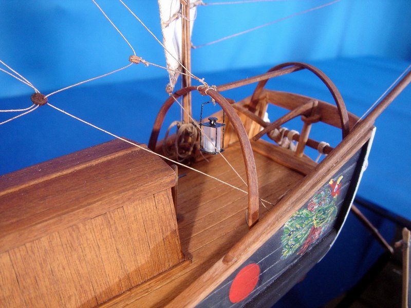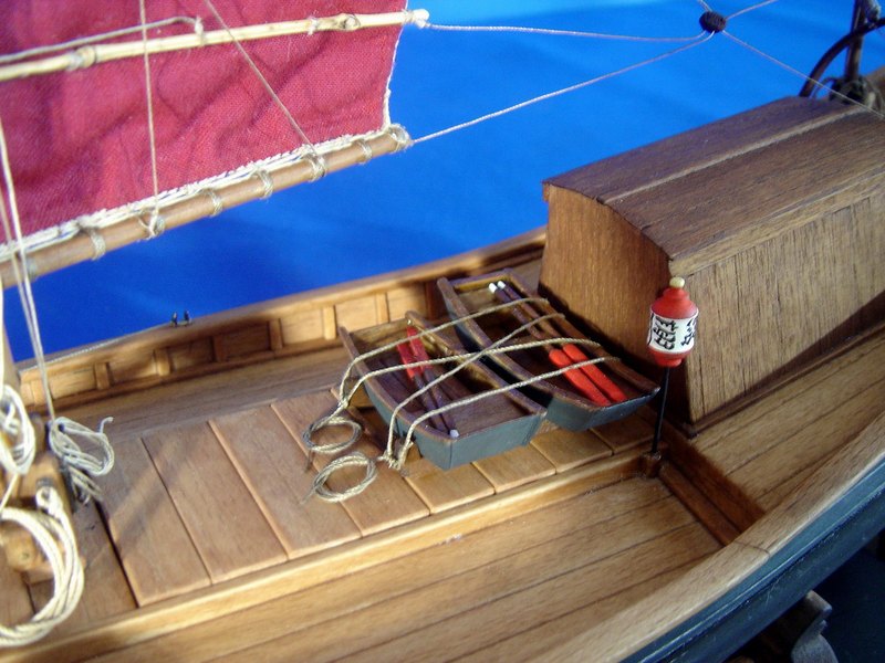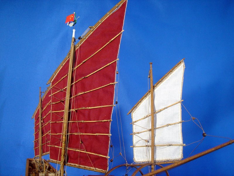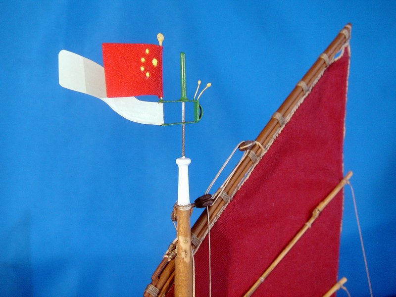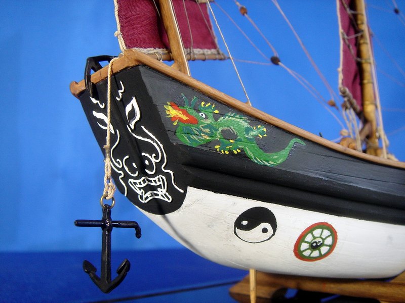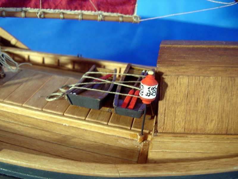 Giunca ideata per la navigazione costiera e fluviale , come quelle che si possono vedere nella baia di Hang Tcheon , fino all’imboccatura dello Yang Tse. Sono adibite al trasporto di merci leggere, come piante medicinali, ma anche per il trasporto di cotone e carbone . Vengono pure impiegate nella pesca. La loro lunghezza varia dai 20 ai 30 metri e hanno un’ampia velatura distribuita su due o tre alberi. Vengono governate con un timone e due derive laterali allo scafo. La bellezza dell’imbarcazione riprodotta dal modello è data soprattutto dai dipinti che la ornano. A prua e a poppa sono dipinte due maschere , di cui una in rilievo. Sulle fiancate sono dipinti il drago, simbolo tipico delle regine, ed il bene e il male, simbolo di protezione. Infine, a poppa è dipinta la fenice, simbolo propiziatorio.