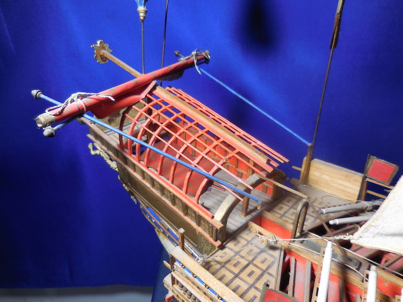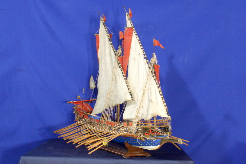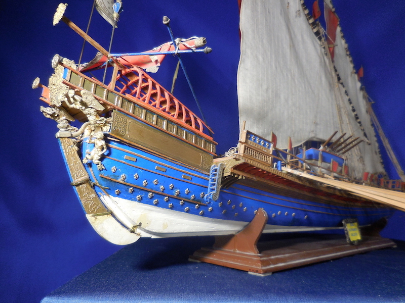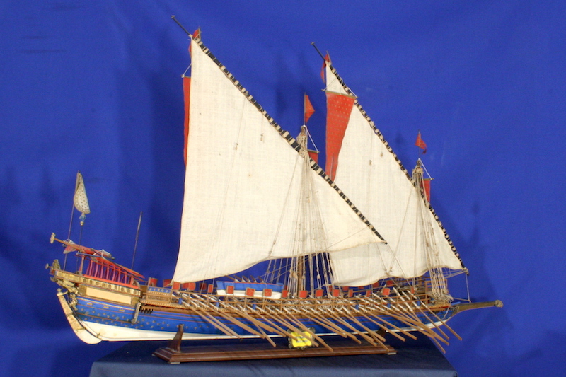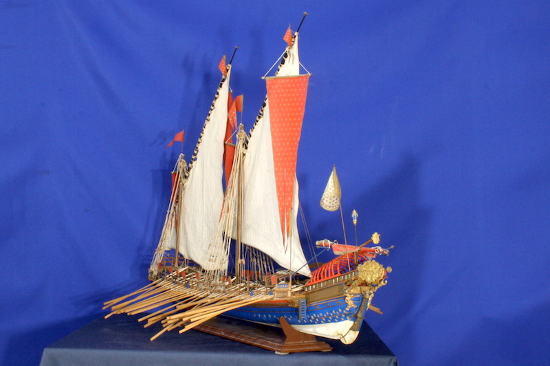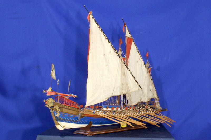 La Real de France era una Galea o Galera. Utilizzava, come sistema di propulsione, i remi. Disponeva, naturalmente, anche di vele che venivano usate per la navigazione. Una nave di questo tipo, essendo costruita per scopi militari, affidava le sue manovre, in caso con il contatto con il nemico, soprattutto la spinta dei remi. Questo modello riproduce, fin nei minimi dettagli, l’imbarcazione originale che fu decorata dallo scultore francese Pierre Puget. La nave era lunga 63 metri e larga 9,70. Aveva 59 banchi e 59 remi, manovrati da 7 vogatori ciascuno. Qualcuno si chiederà perché i remi non erano in numero pari. La risposta è molto semplice: sul lato di dritta ne mancava uno per lasciare spazio ai pentoloni della cucina.