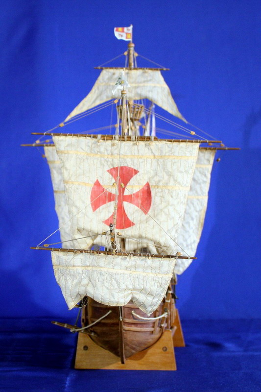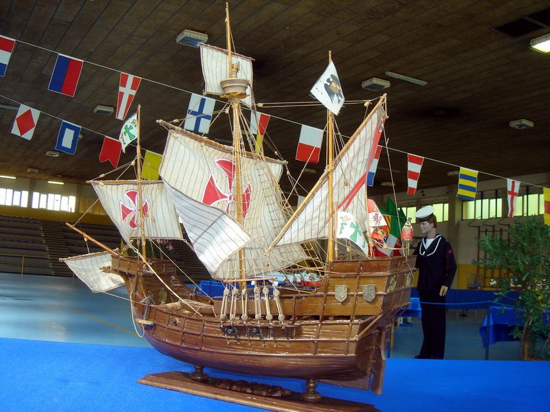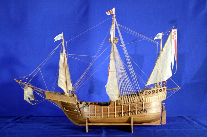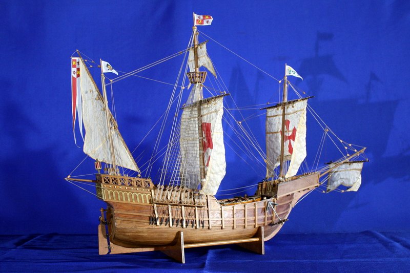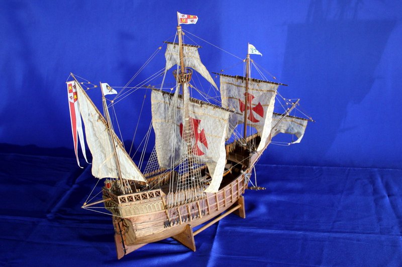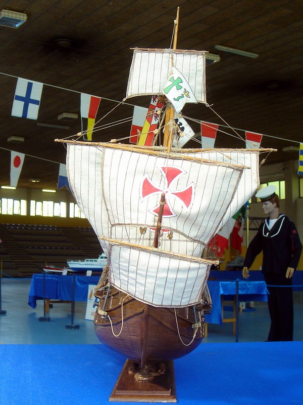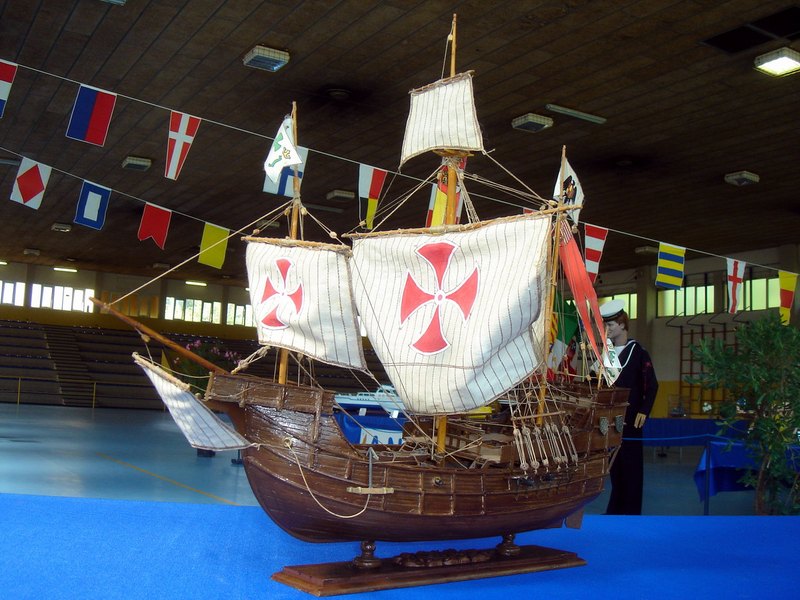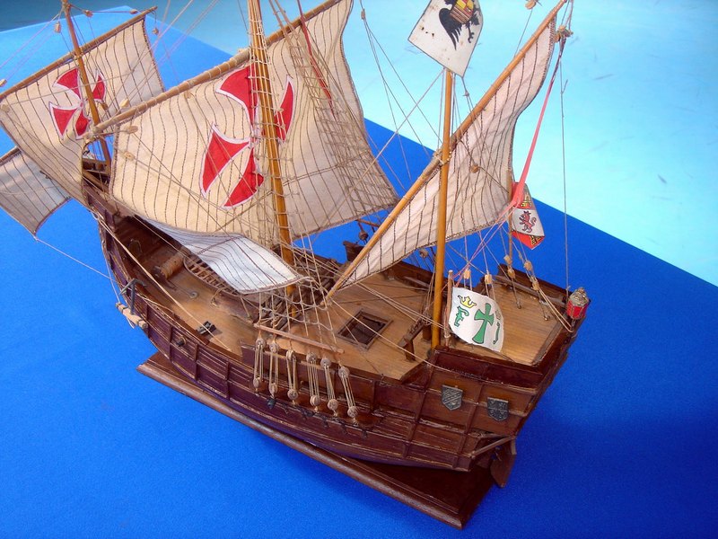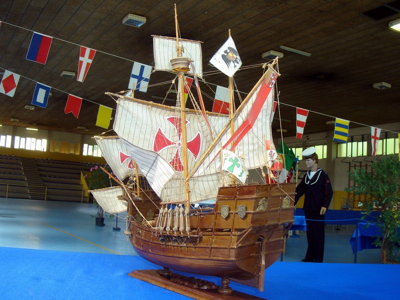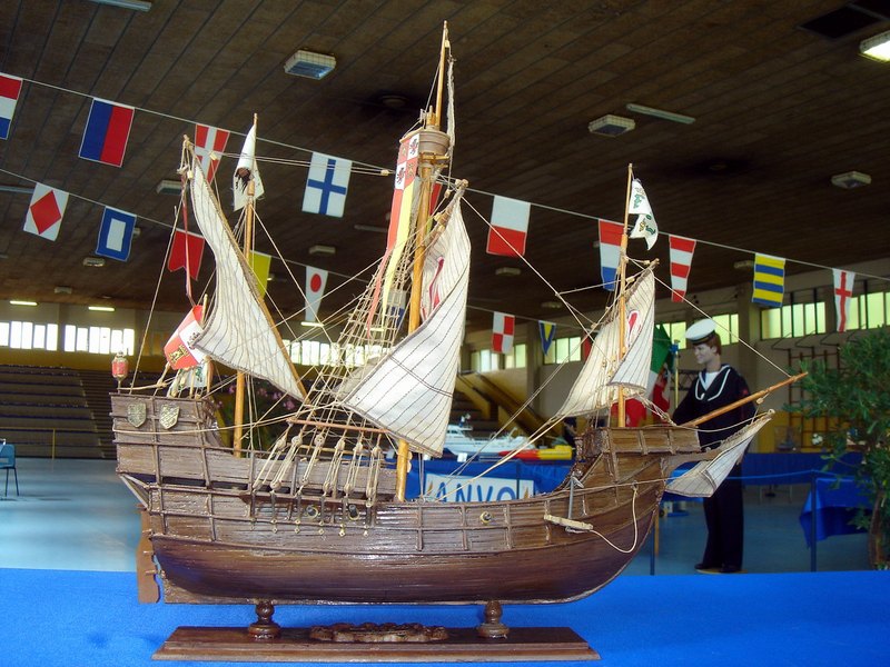 La Santa Maria fu la nave ammiraglia nella spedizione con la quale Cristoforo Colombo, partito il 3 Agosto 1492 dal porto di Palos della Frontera, raggiunse il continente americano dopo 71 giorni di viaggio. Costruita a Santander era molto robusta e faceva servizio mercantile con il nome di Galenda. Apparteneva a Juan De La Casa che la noleggiò per l’impresa. Era una Caracca lunga 39 e larga 8 metri, a tre alberi con vele quadre ed una stazza che, ai valori attuali, era di 51 tonnellate. L’albero di maestra era alto 26,6 metri con il grande “trevo”, estendibile con due coltellacci laterali, sul quale era dipinta la Croce di Castiglia e, sopra, una piccola vela di gabbia. Sull’albero di trinchetto c’era l’omonima vela e, sull’albero di mezzana, la vela latina triangolare. Sul bompresso c’era la Civada. A poppa c’era un cassero nel quale si trovava la cabina di Cristoforo Colombo mentre gli altri componenti dell’equipaggio che raggiungeva i 52 uomini dormivano sotto il ponte di coperta. La Santa Maria era in grado di tenere una buona velocità che, in condizioni favorevoli, poteva raggiungere anche i 10-12 nodi. Era armata con 4 bombarde da 90 mm, colubrine e armi portatili. Si arenò a Hispaniola e andò perduta. Cristoforo Colombo proseguì il viaggio sulla Pinta.