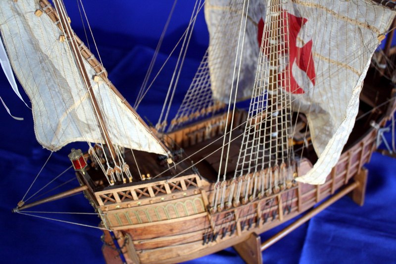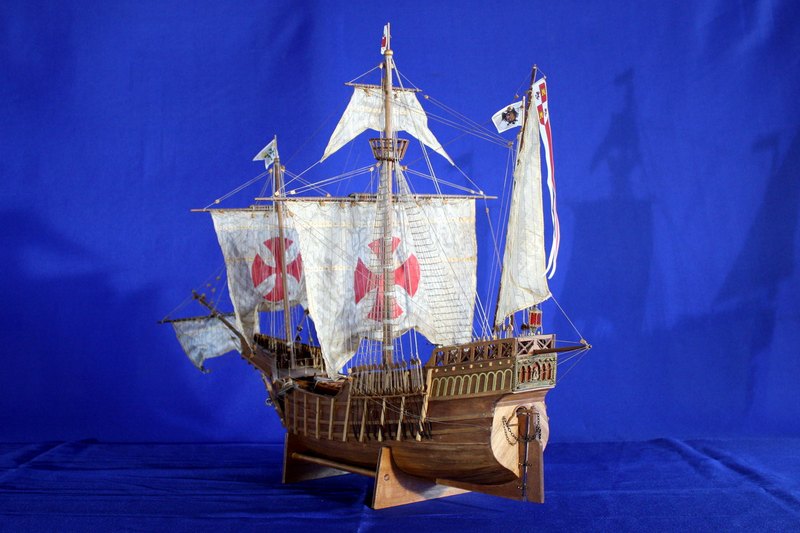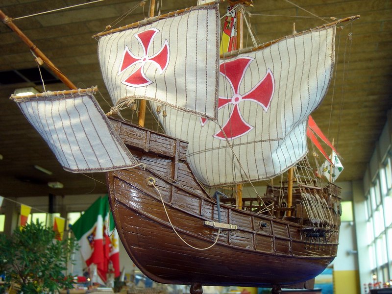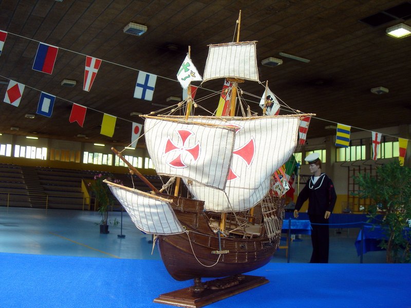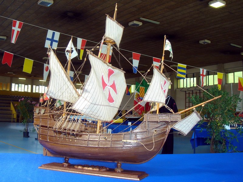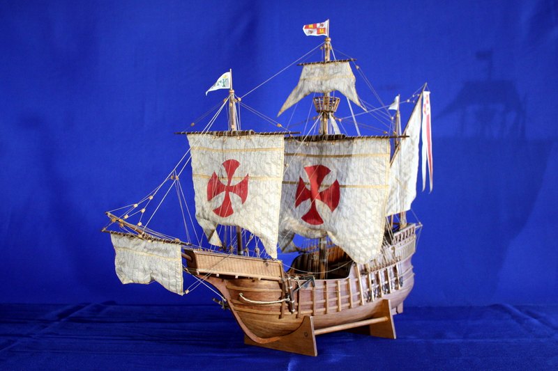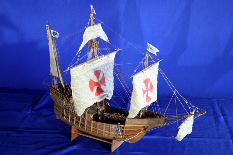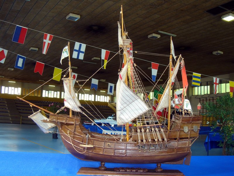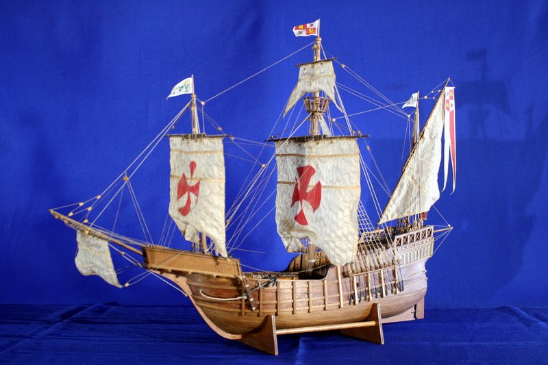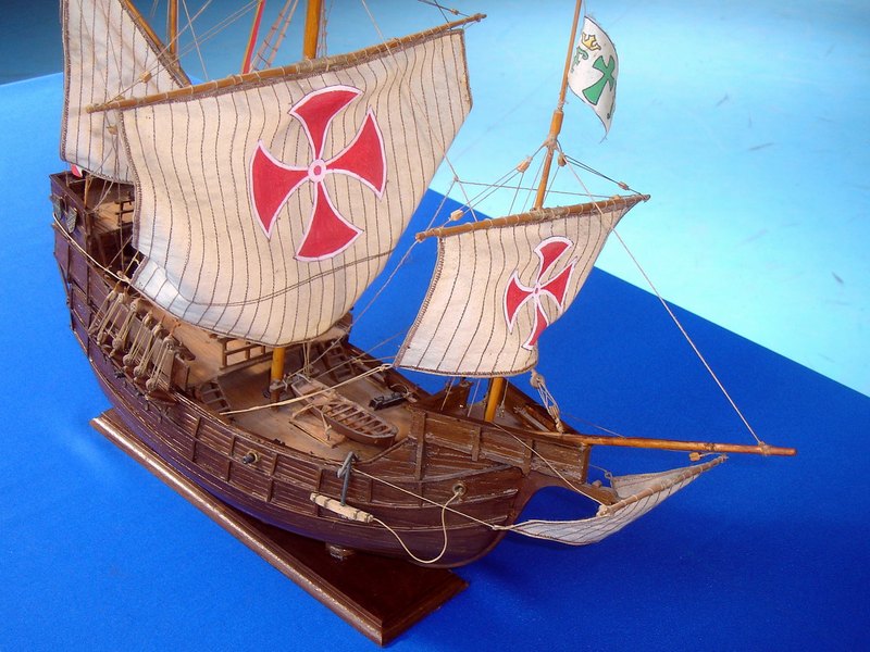 La Santa Maria fu la nave ammiraglia nella spedizione con la quale Cristoforo Colombo, partito il 3 Agosto 1492 dal porto di Palos della Frontera, raggiunse il continente americano dopo 71 giorni di viaggio. Costruita a Santander era molto robusta e faceva servizio mercantile con il nome di Galenda. Apparteneva a Juan De La Casa che la noleggiò per l’impresa. Era una Caracca lunga 39 e larga 8 metri, a tre alberi con vele quadre ed una stazza che, ai valori attuali, era di 51 tonnellate. L’albero di maestra era alto 26,6 metri con il grande “trevo”, estendibile con due coltellacci laterali, sul quale era dipinta la Croce di Castiglia e, sopra, una piccola vela di gabbia. Sull’albero di trinchetto c’era l’omonima vela e, sull’albero di mezzana, la vela latina triangolare. Sul bompresso c’era la Civada. A poppa c’era un cassero nel quale si trovava la cabina di Cristoforo Colombo mentre gli altri componenti dell’equipaggio che raggiungeva i 52 uomini dormivano sotto il ponte di coperta. La Santa Maria era in grado di tenere una buona velocità che, in condizioni favorevoli, poteva raggiungere anche i 10-12 nodi. Era armata con 4 bombarde da 90 mm, colubrine e armi portatili. Si arenò a Hispaniola e andò perduta. Cristoforo Colombo proseguì il viaggio sulla Pinta.